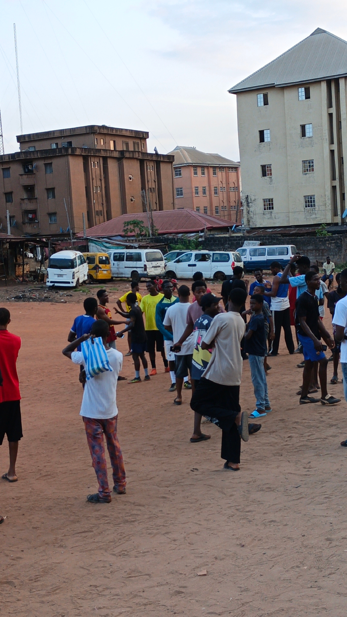 The image captures a vibrant gathering of young men and boys on a reddish-brown dirt field, likely in Onitsha, Nigeria. The group, consisting of approximately twenty individuals, is scattered across t…read more