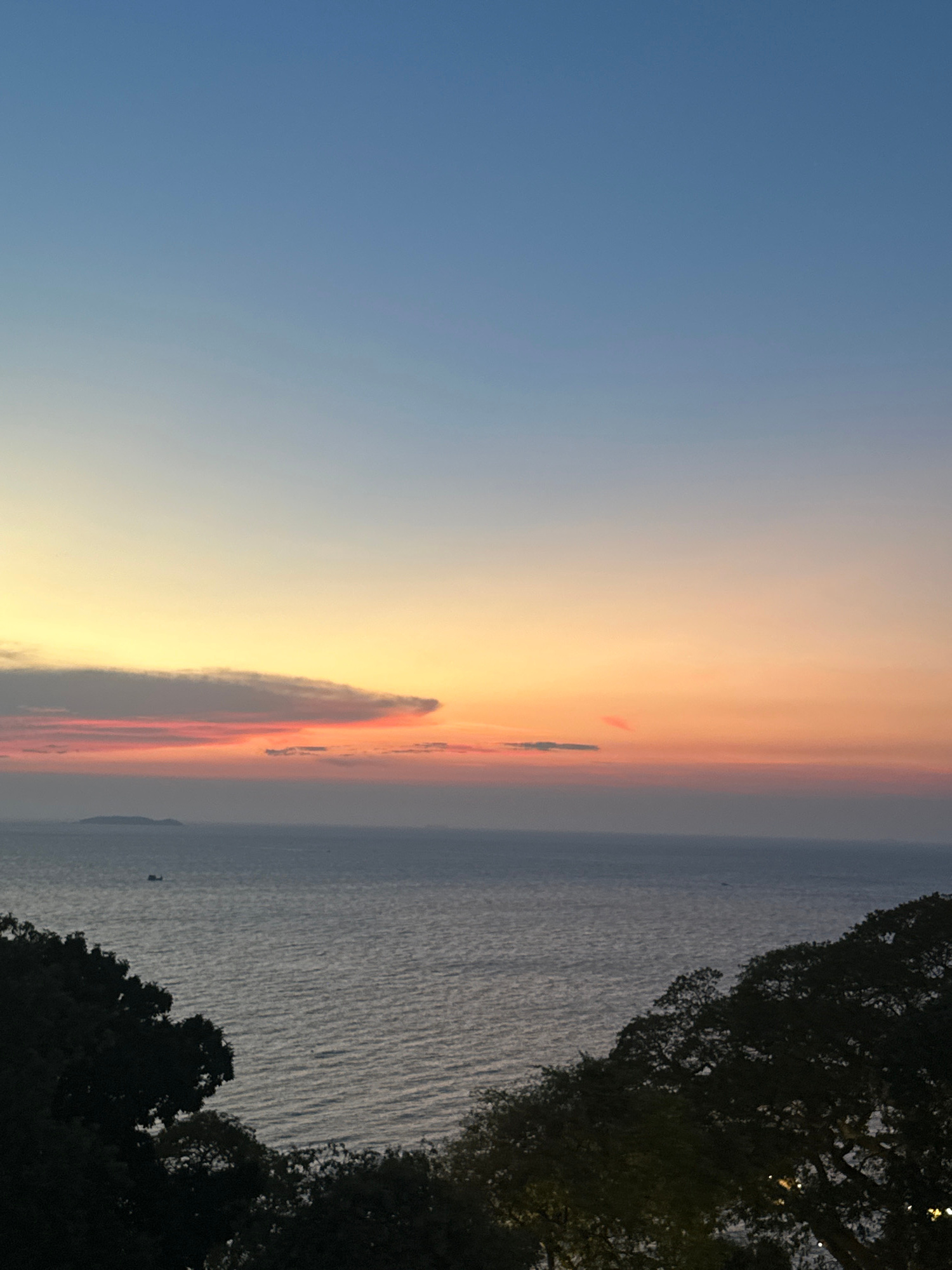 The image depicts a sunset over the ocean, likely in Pattaya City, Thailand, based on the landscape and geographical features. The sky transitions from a clear blue on the left to shades of orange, pi…read more