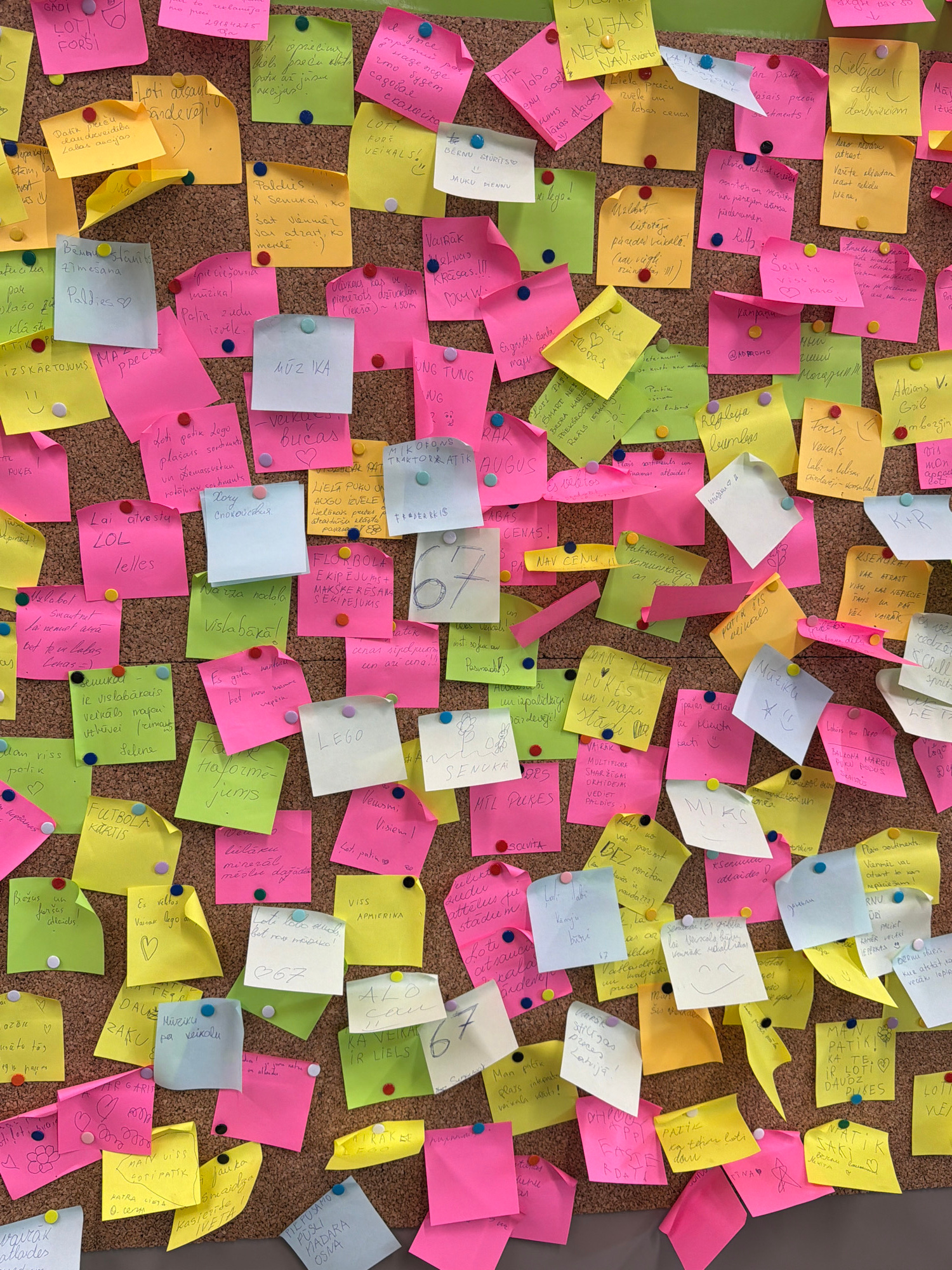 The image shows a corkboard densely covered with colorful sticky notes, predominantly in pink, yellow, and green. The notes are attached with various colored pushpins. Most of the notes appear to have…read more