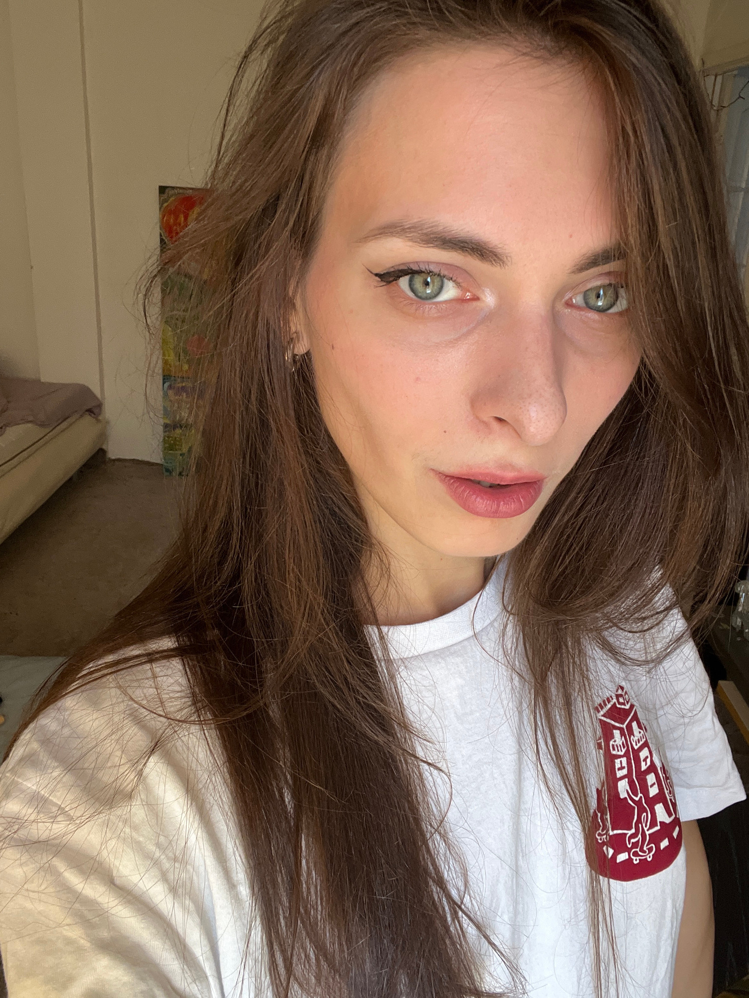 A woman with brown hair and green eyes looks at the camera. She wears a white t-shirt with a maroon design on the left sleeve. The background shows part of a white wall with a small painting visible,…read more