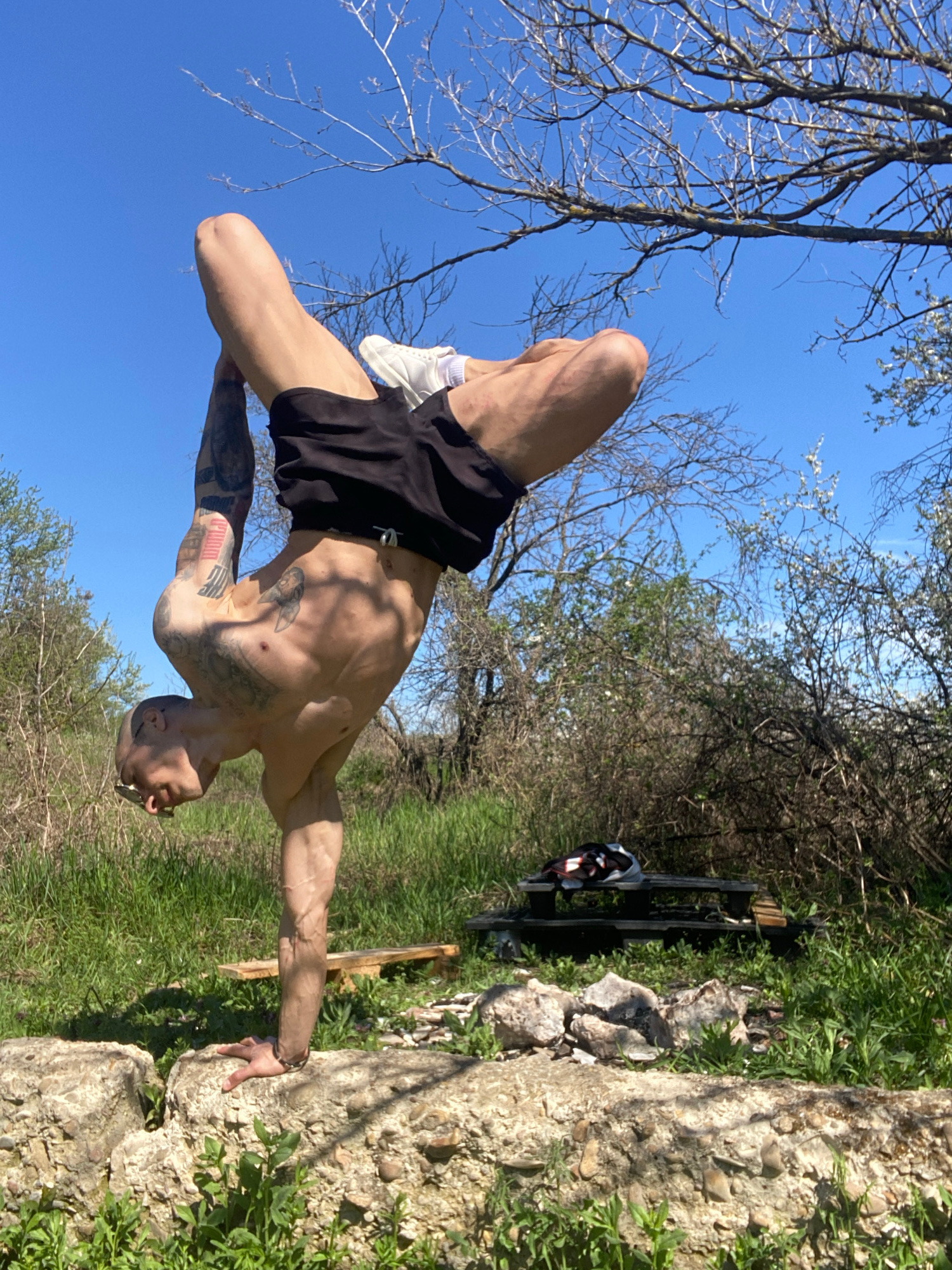 A man is performing a yoga pose outdoors. He is wearing black shorts and white shoes. He has numerous tattoos on his torso and arms. He is balancing on one hand placed on a large rock, with the other…read more