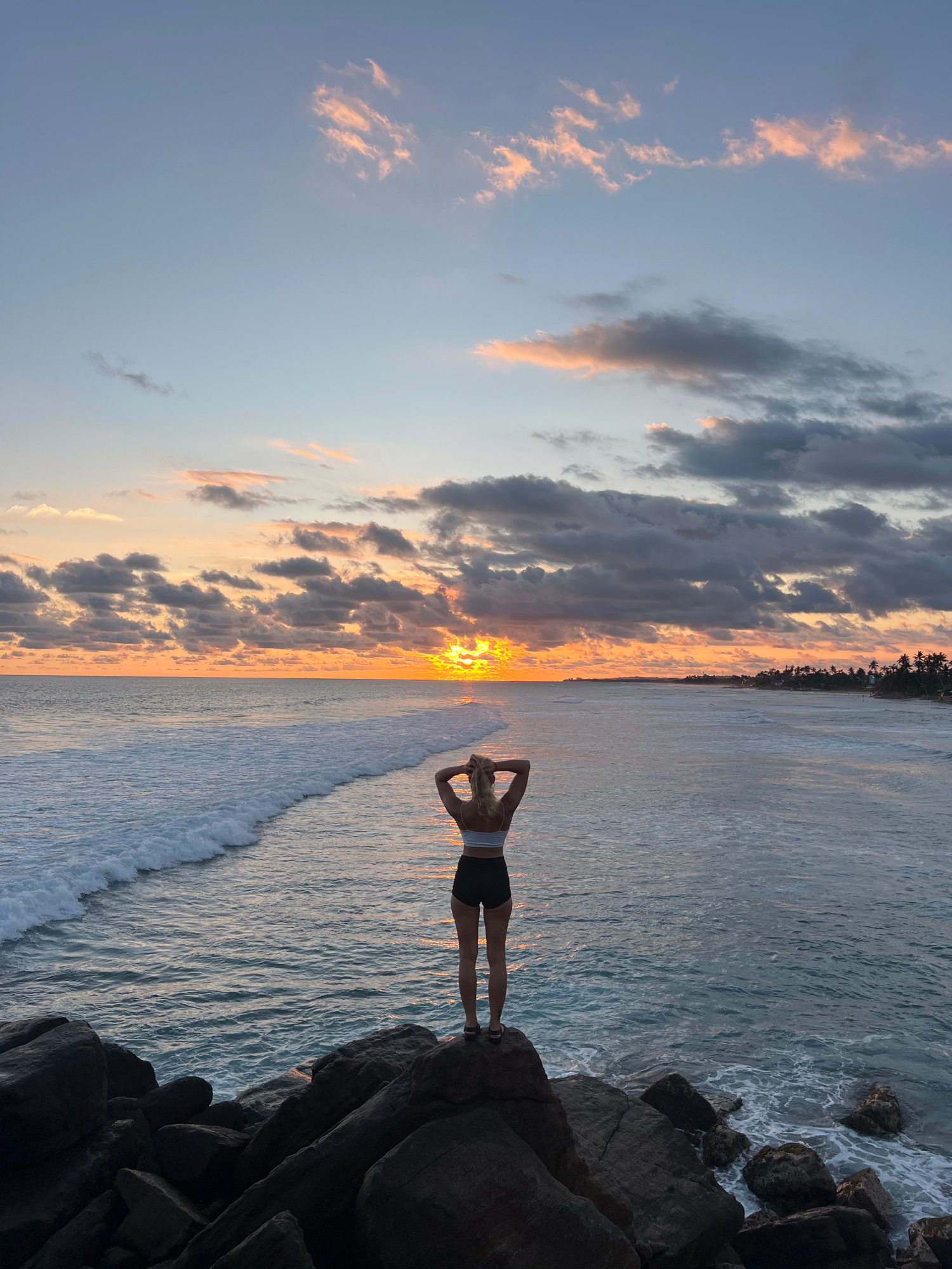 A woman stands on rocks overlooking the ocean, silhouetted against a sunset at Goviyapana, Sri Lanka. The sky has a mix of light blue with light orange clouds and dark storm clouds. The sun is settingβ¦read more