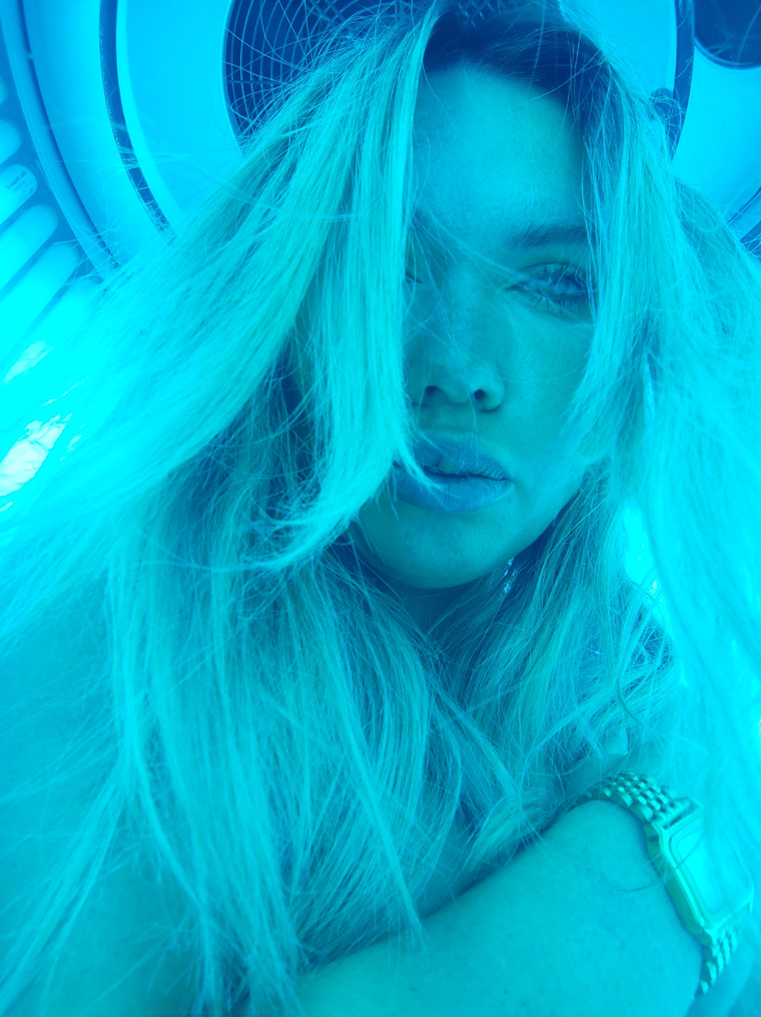 A woman with long, blonde hair is in a tanning bed. The lighting is a bright blue. Her face is partially obscured by her hair. A gold watch is visible on her wrist. The tanning bed has a fan. The loca…read more