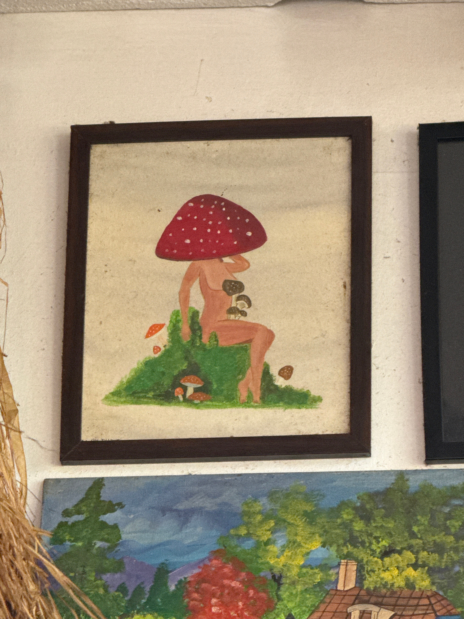 The image depicts two framed artworks hanging on a white wall. The frame at the top is black and rectangular. The frame below contains a painting of a nude figure lying on green vegetation with a largβ¦read more