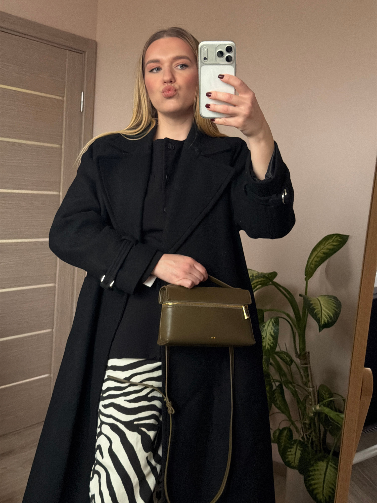 A woman is taking a selfie in a mirror. She is wearing a black coat and carrying a small, olive green purse. Part of a zebra-print garment is visible. A houseplant sits on a surface behind her. A beig…read more