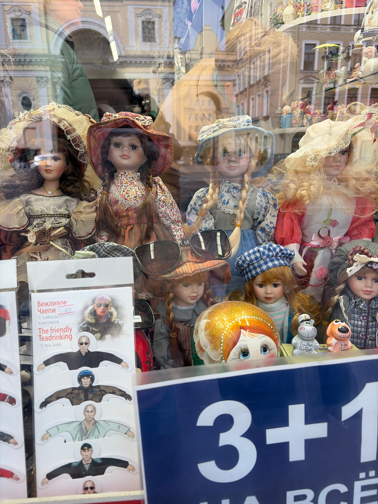 The image shows a shop window display in Saint Petersburg, Russia, filled with dolls and various souvenirs. Several porcelain dolls dressed in vintage clothing and hats are visible. Among the dolls arβ¦read more