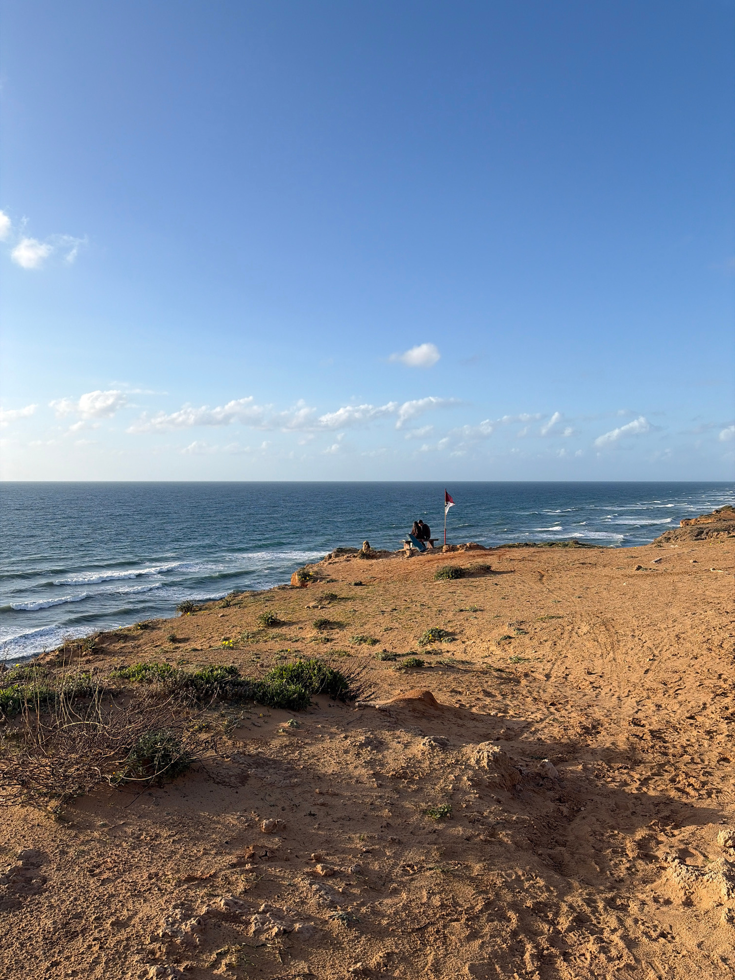 A horizontal panoramic view captures the Israeli coastline at Arsuf. Clear blue sky occupies the left portion of the frame, contrasting with the deep blue of the sea extending vertically to the center…read more