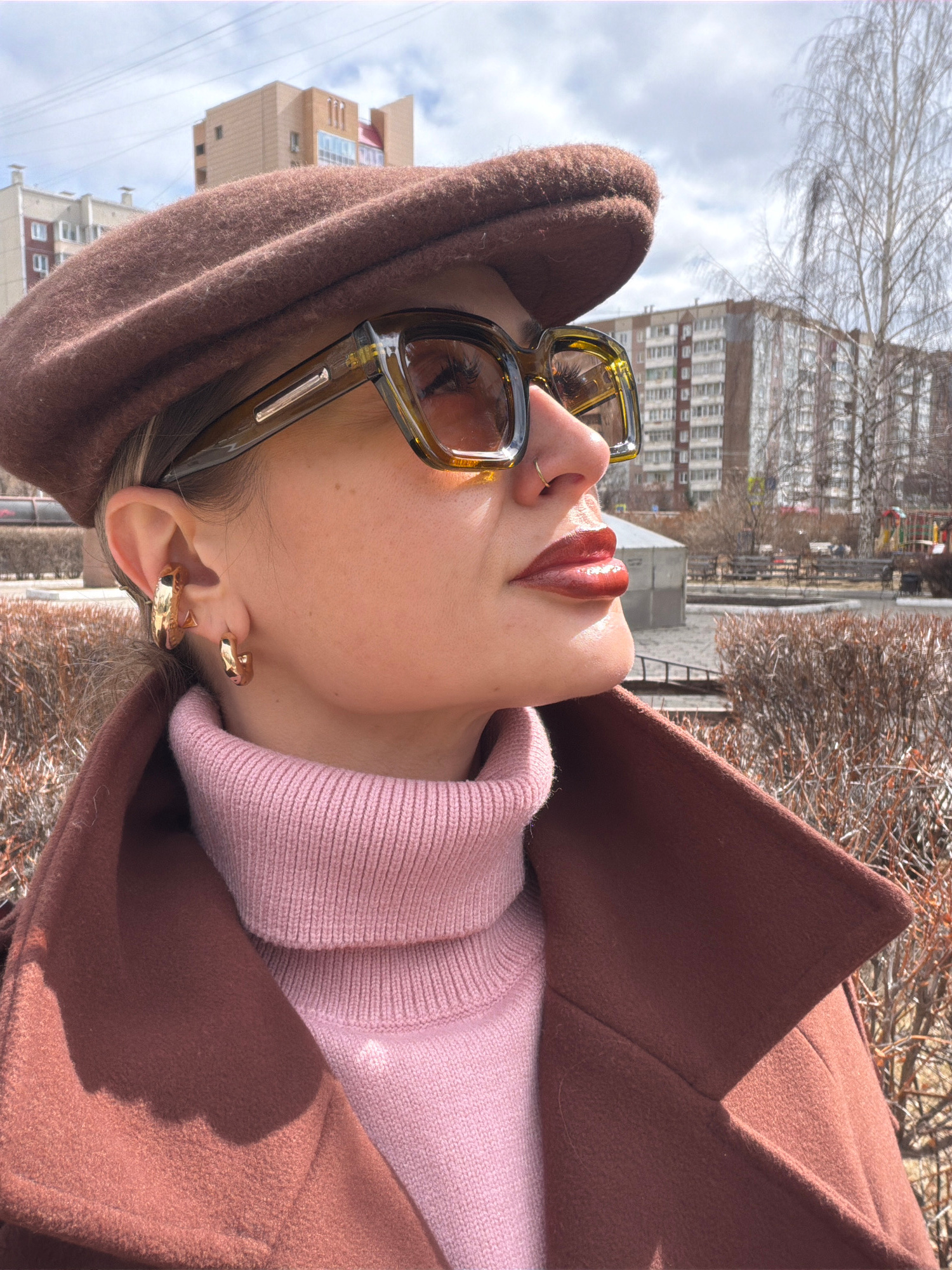 An upward-facing, close-up shot shows a person's profile from the nose up in an urban outdoor setting, likely Krasnoyarsk, Russia. The subject wears large olive-framed sunglasses, a small gold nose ri…read more