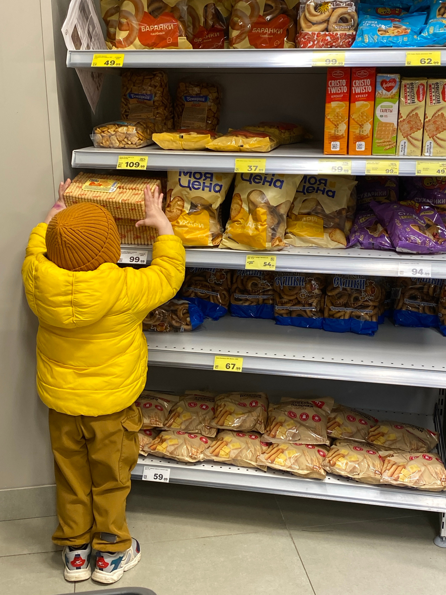 A child in a yellow puffer jacket and brown pants lies prone on the floor of a grocery store in Sochi, Russia, reaching for a box of cookies on a shelf. The child also wears a brown knit hat and sneak…read more