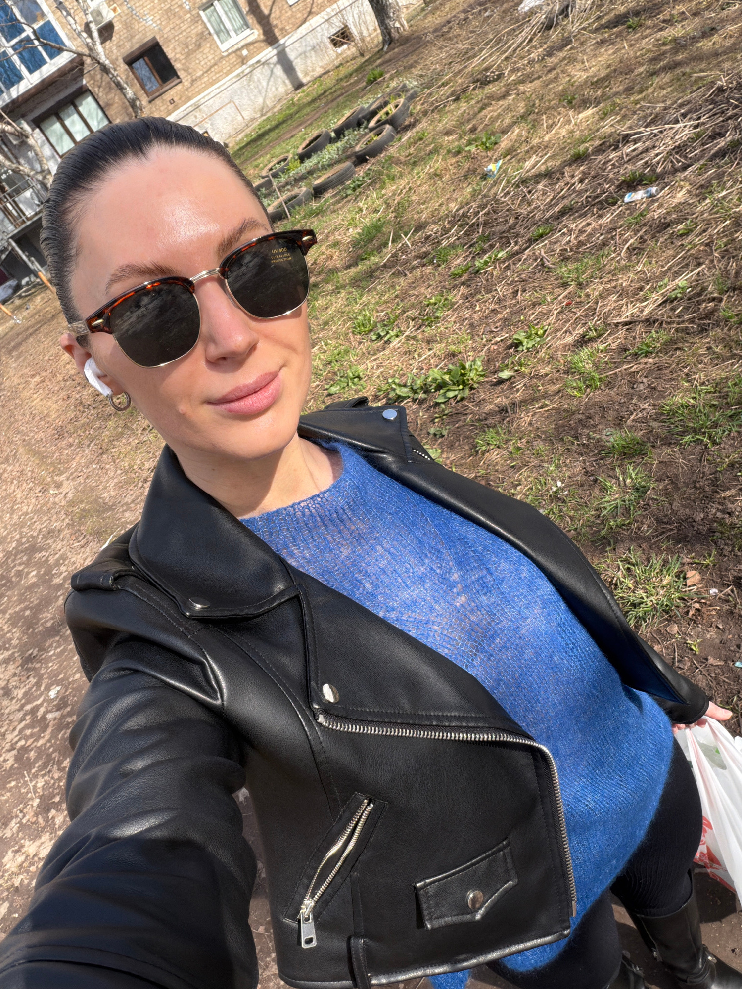 A woman wearing sunglasses, a blue sweater, and a black leather jacket poses for a selfie. She is wearing an earbud in her right ear. She is also wearing black pants or leggings and black boots. She i…read more