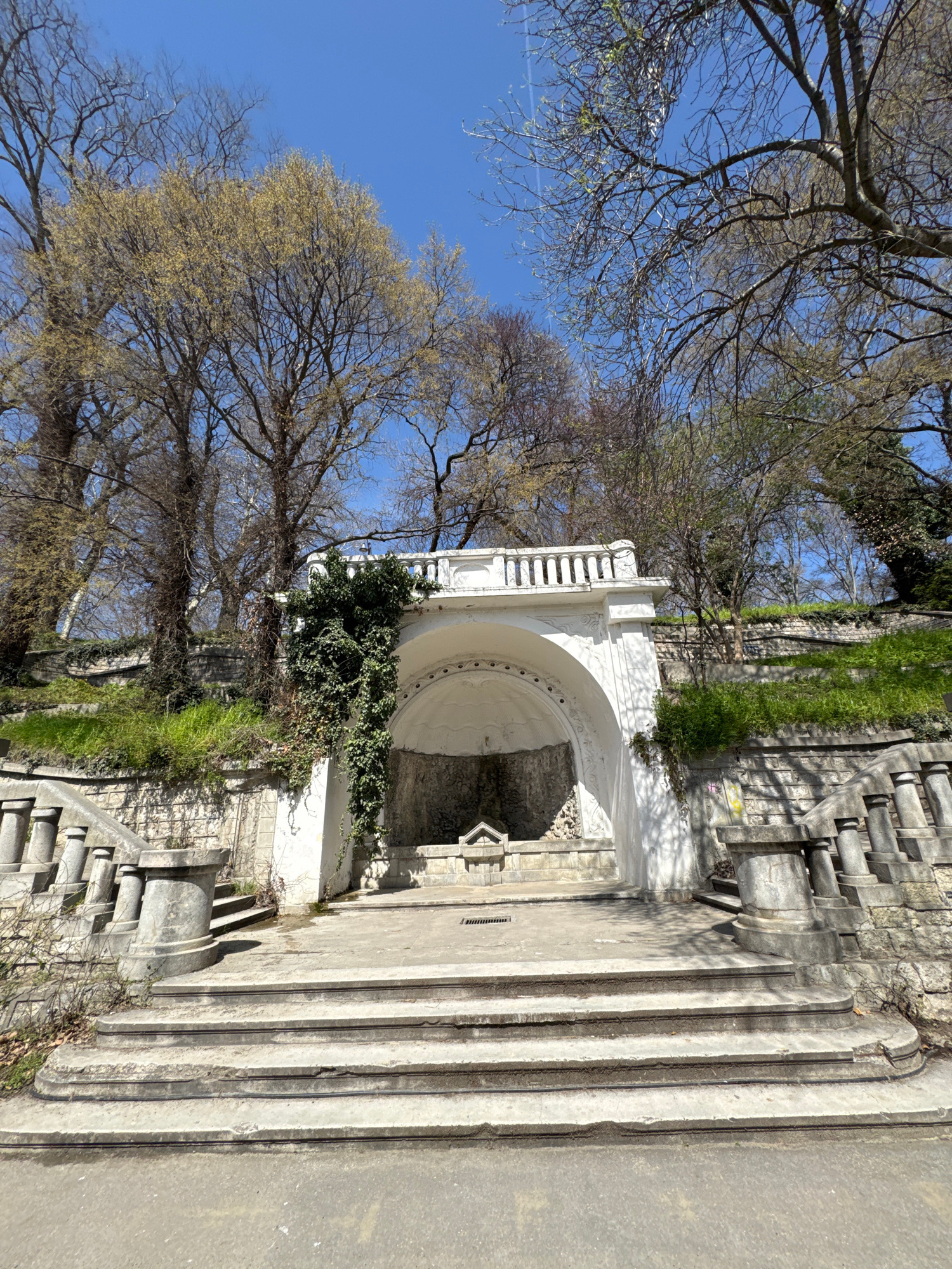 The image captures an outdoor scene dominated by a white, ornate architectural structure, possibly a historical fountain, grotto, or monument, situated within a park or garden environment. This centra…read more