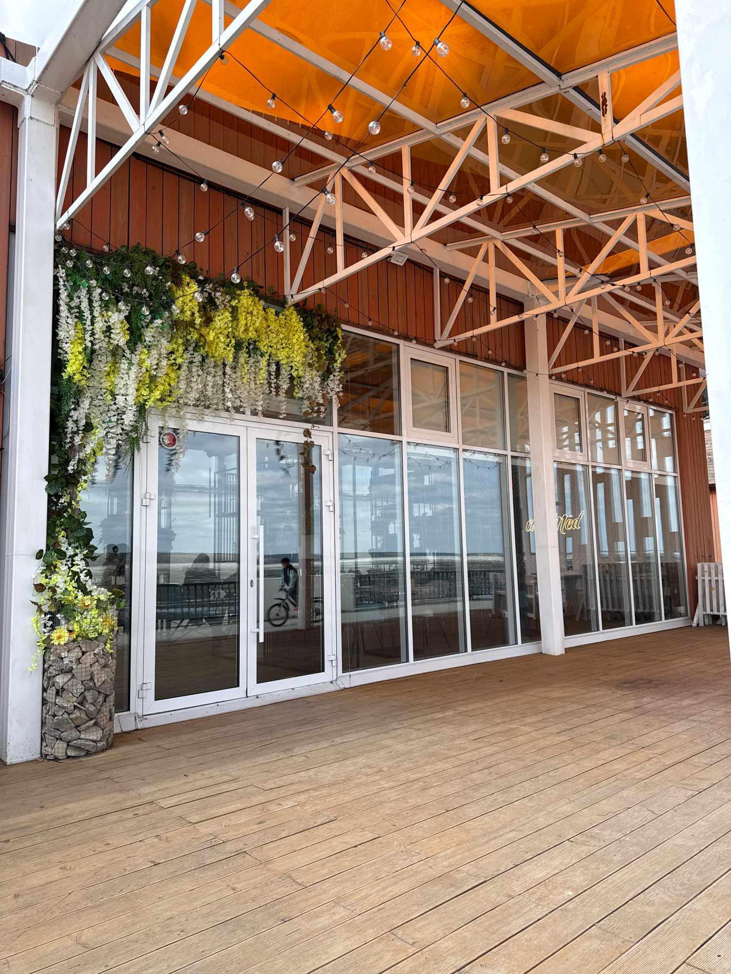 The image depicts a building's facade in Chaikovsky, Russia. The building has a glass and white-framed window wall adorned with floral arrangements. A metal frame canopy with a partially translucent o…read more
