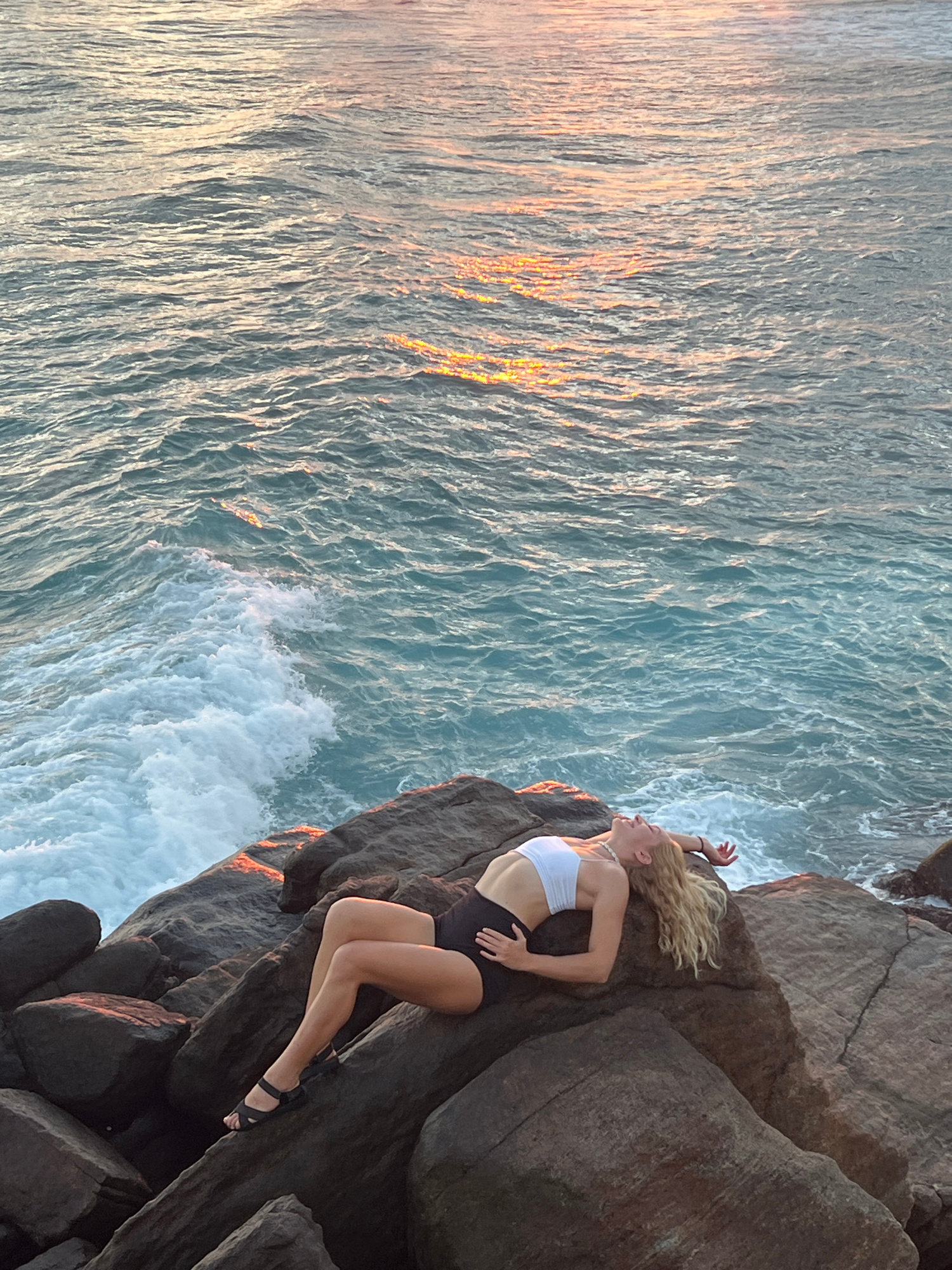 A woman in a white top and dark shorts lies on rocks near the water. Her blonde hair is spread out. She wears black sandals. The scene is Goviyapana, Sri Lanka. The water is rough with waves. Sunlight…read more