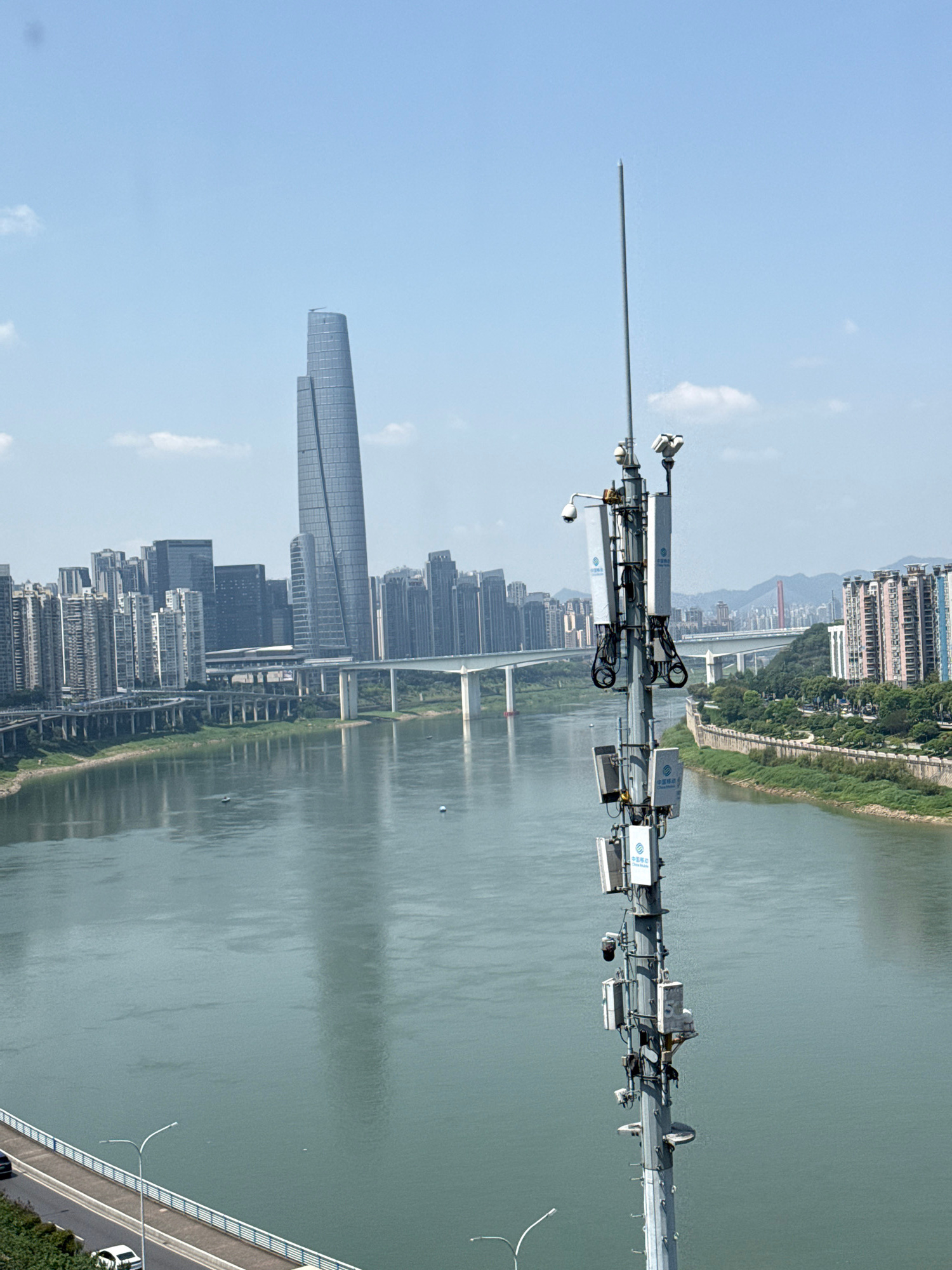 This image presents a vibrant urban landscape, likely taken from a bridge or high vantage point in Yuzhong District, China. The scene is dominated by a wide river flowing through a modern city under a…read more