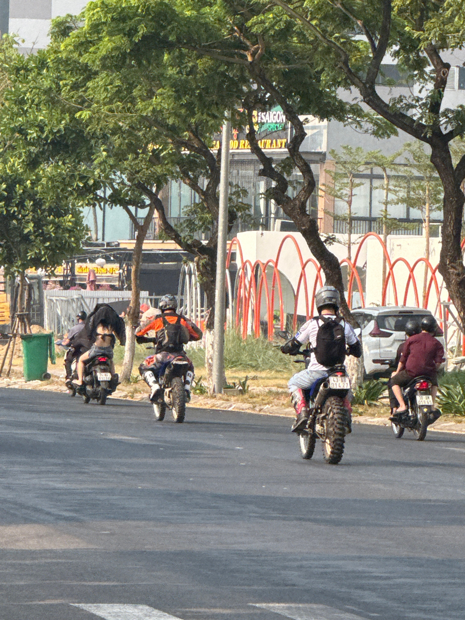 The image shows a street scene in Đà Nẵng, Vietnam. On the right is a gray asphalt road. Several motorcycles are driving on the road. The first motorcycle has a rider in a maroon top. The second motor…read more
