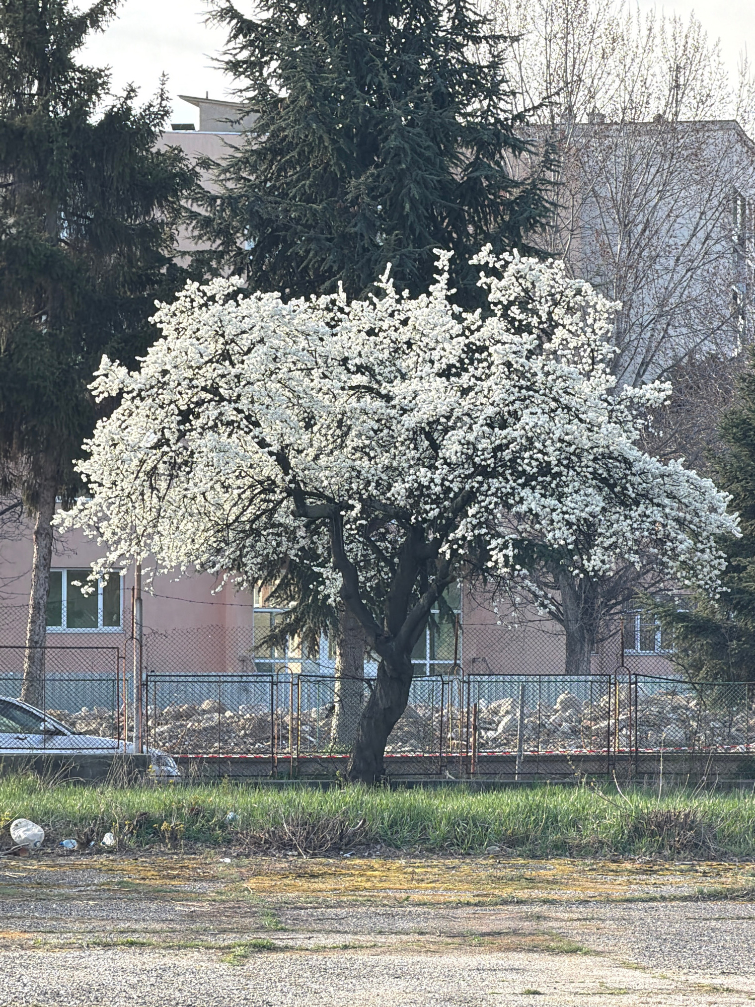 The image shows a blooming tree with white flowers in an urban environment. A building with a pink facade and white window frames is visible behind the tree. A chain-link fence separates the tree and…read more