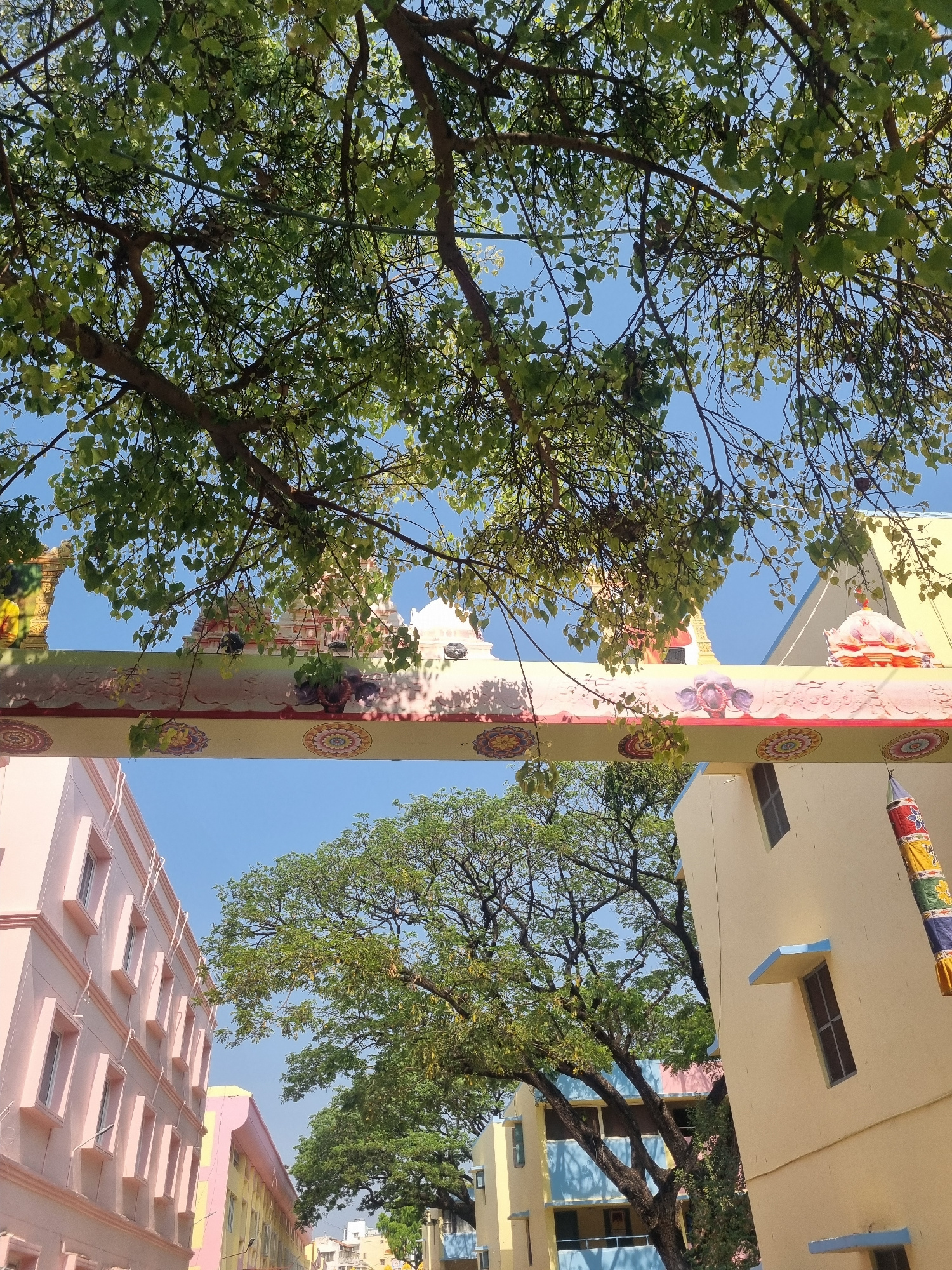The image, likely taken in Puttaparthi, India, shows a view of local architecture framed by trees. At the center is a tall, decorated pillar, typical of Hindu temples, suggesting the location is near…read more