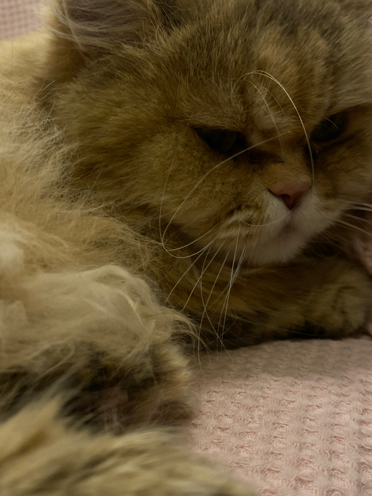 The image is a close-up of a tan and brown cat sleeping. The cat's nose is pink, and its whiskers are white. The cat is lying on a pink textured blanket. The location in Kazan, Russia, is not discerni…read more