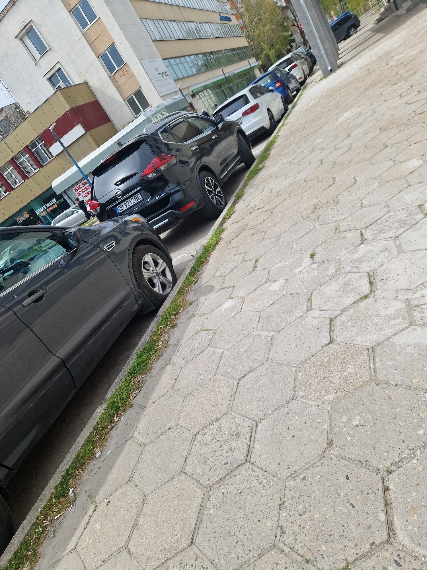 The image depicts a street scene in Lovech, Bulgaria, with several cars parked along the roadside. The cars are of various colors and models. A building with a sign that reads "JOYS," "SUL," and "ДРЕХ…read more