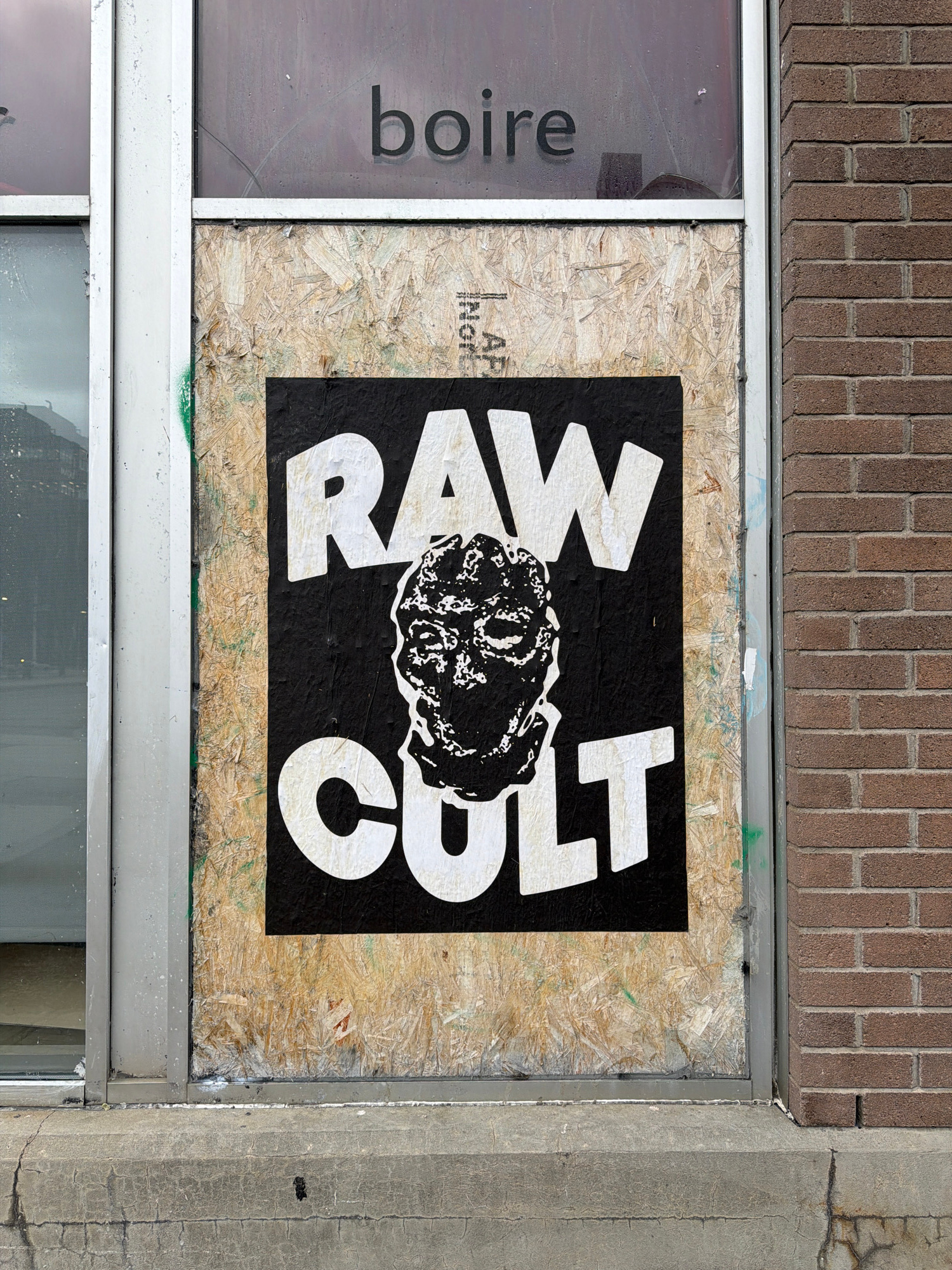 The image shows a storefront in Montreal, Canada, with boarded-up windows. The windows are partially covered by plywood, over which a black and white poster reading "RAW CULT" is affixed. To the left…read more