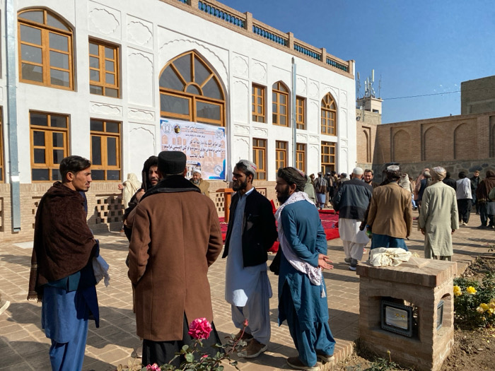 The image depicts an outdoor gathering of approximately 30-40 adult males within the **Ahmad Shahi Mosque Complex** in Kandahar City, Afghanistan. The scene unfolds under a clear blue sky on a brightβ¦read more