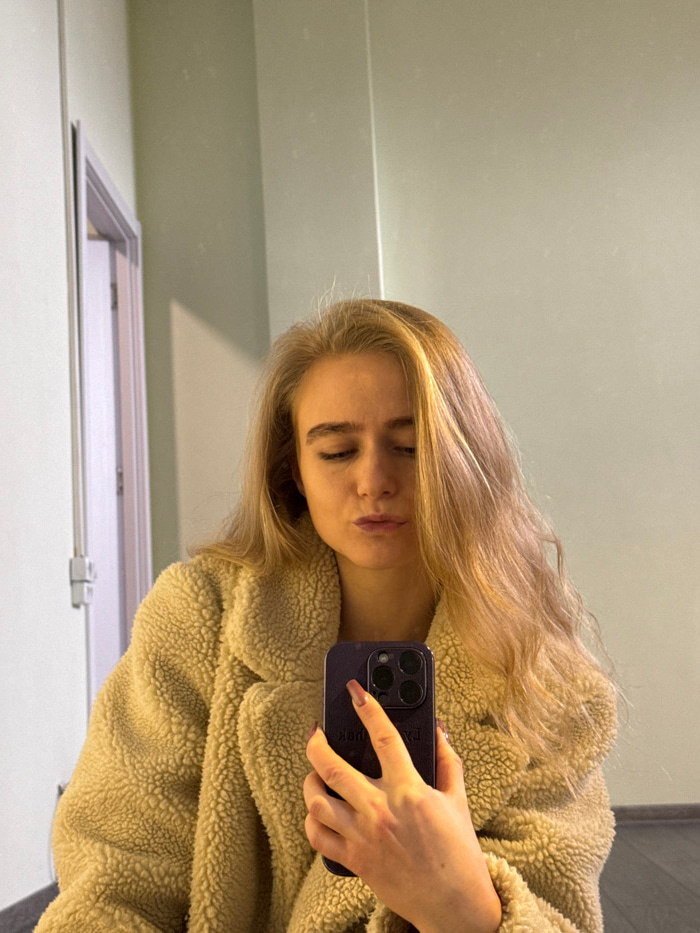 An adult female is depicted in a mirror selfie, positioned indoors. She has long, light blonde hair parted to her right, falling over her shoulders. Her eyes are closed or cast downwards, and her lips…read more