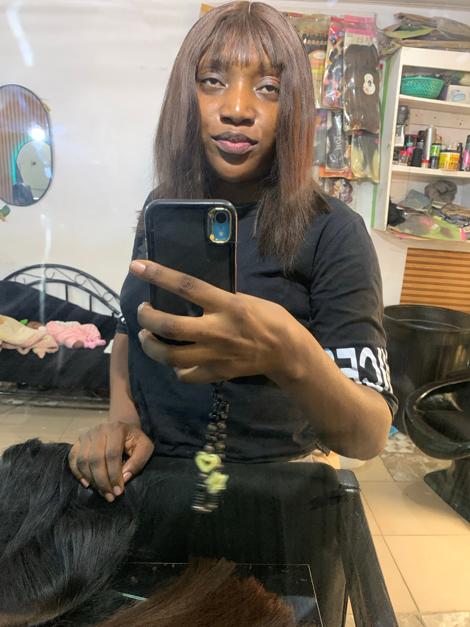 The image shows a person with medium-brown hair and dark skin taking a selfie in what appears to be a hair salon. The person is wearing a black t-shirt and is holding a black smartphone with a gold ri…read more