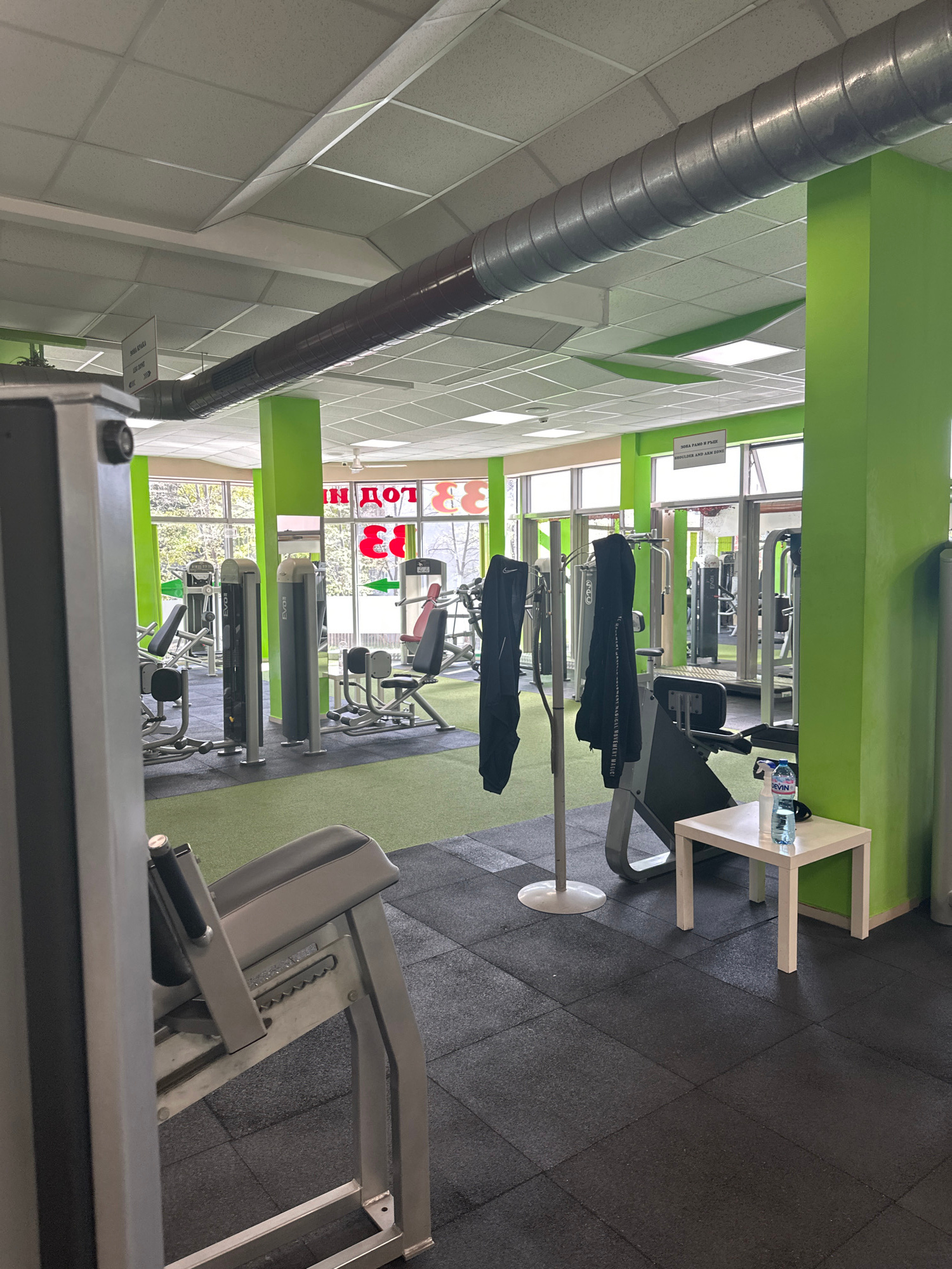 The image captures the interior of a brightly lit gym, devoid of people. The setting features a dominant color scheme of vibrant green walls and columns, contrasting with dark gray rubber floor tiles…read more