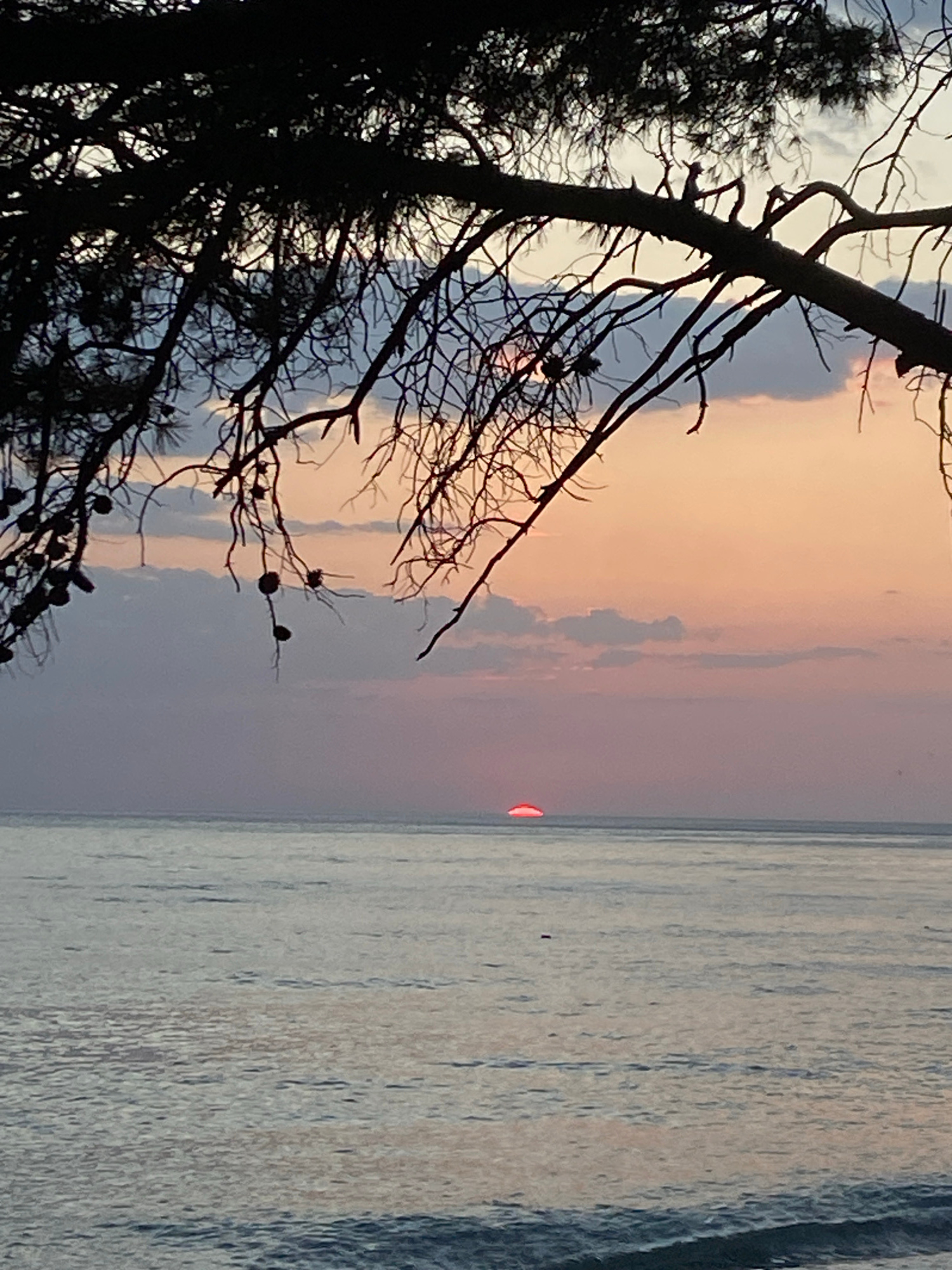 The image captures a sunset scene in Bar, Montenegro, featuring a body of water, possibly the Adriatic Sea. The lower rim of the sun appears red above the horizon. Silhouetted branches and foliage ofโฆread more