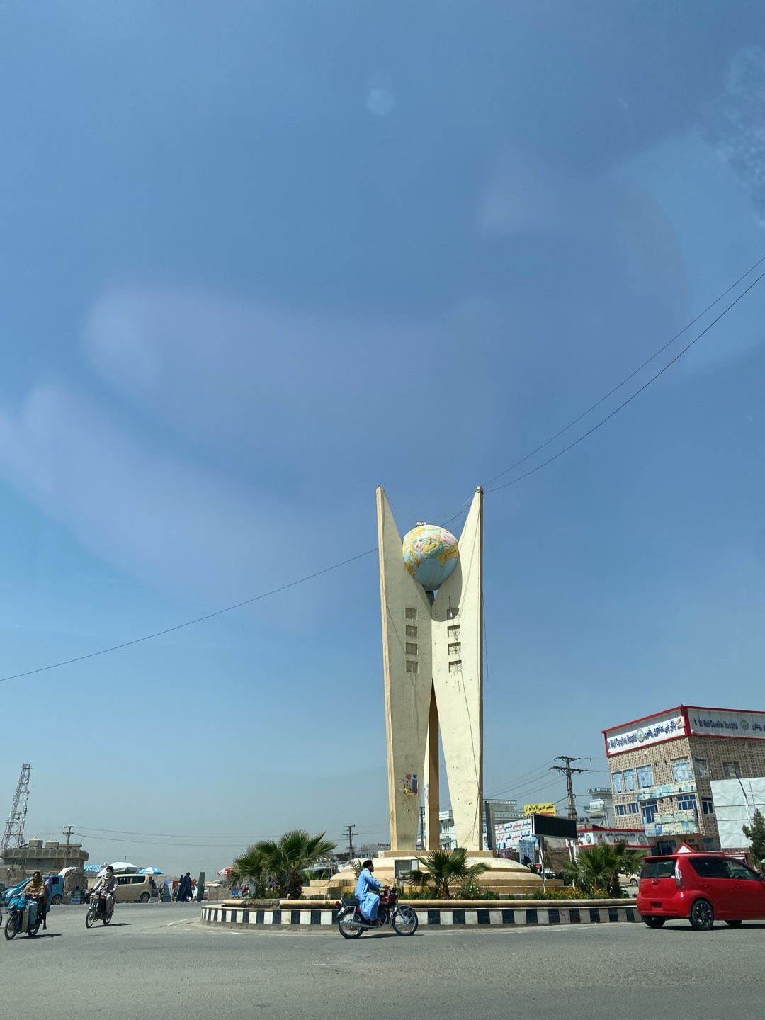 The image depicts a roundabout in Kandahar, Afghanistan, dominated by a tall, concrete monument consisting of two upward-pointing prongs that hold a globe. The monument stands in the center of a round…read more
