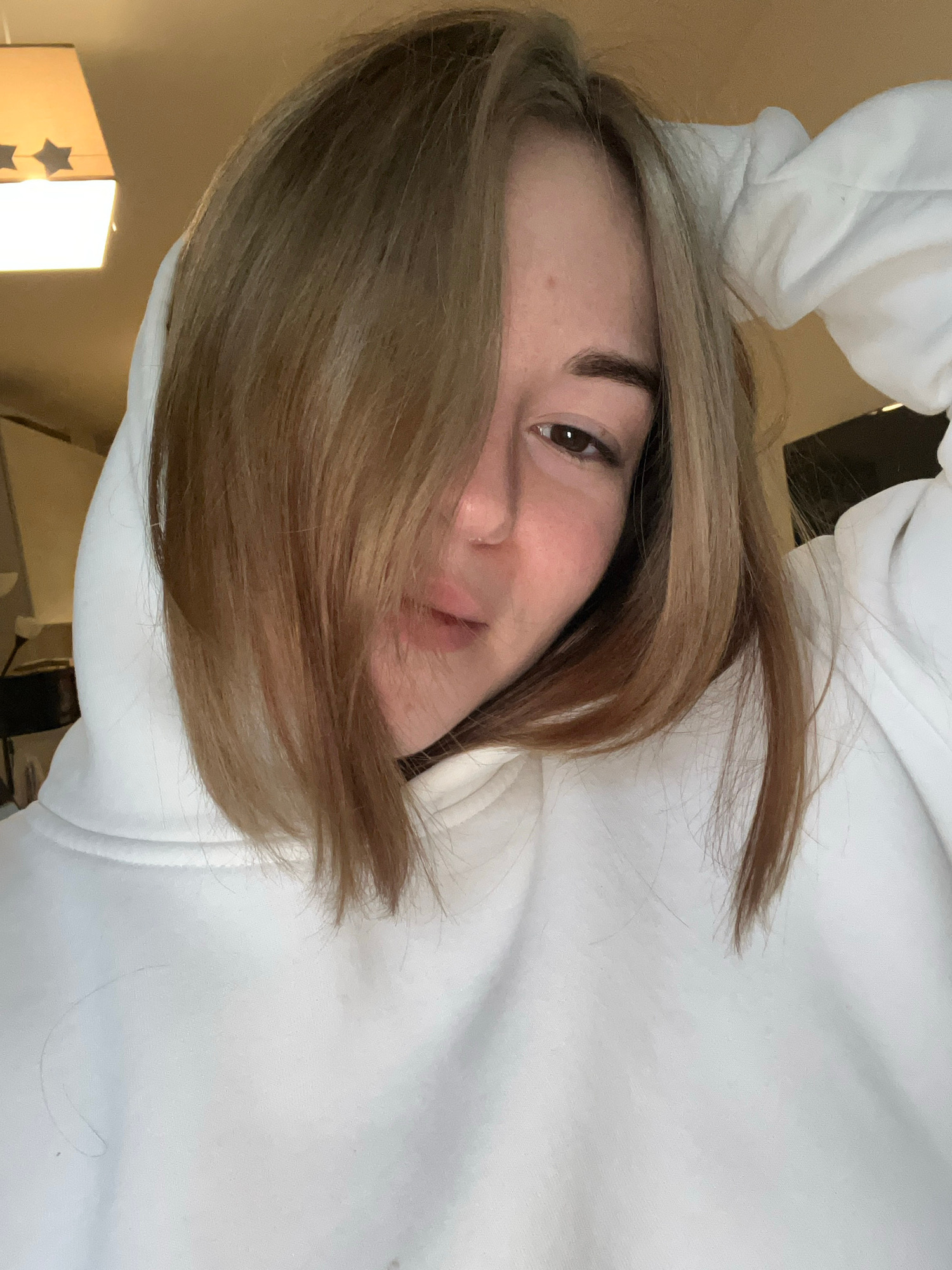 The image displays a close-up, slightly high-angle portrait of a single female individual indoors in Boreti, Montenegro. The subject possesses light brown, shoulder-length hair, styled to partially ob…read more