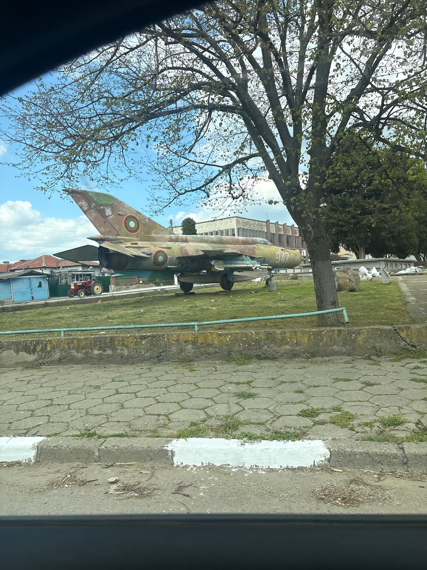 The image depicts a military aircraft, likely a Soviet-era MiG-21, on display outdoors in an urban environment. The aircraft exhibits a camouflage paint scheme with what appears to be national insigniβ¦read more