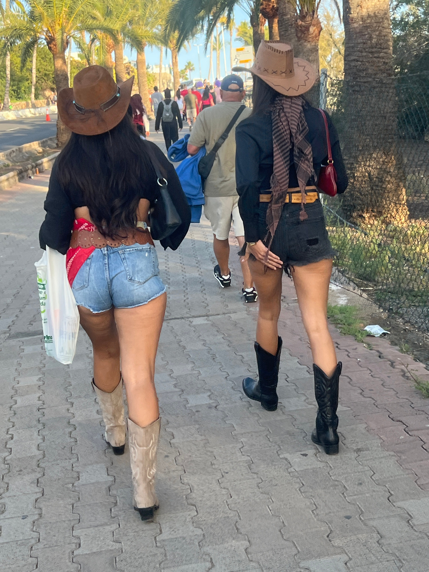 Two women are standing on a sidewalk in San Bartolomé de Tirajana, Spain. Both women are wearing cowboy boots, hats, and denim shorts. The woman on the left is wearing beige boots, a brown hat, and de…read more