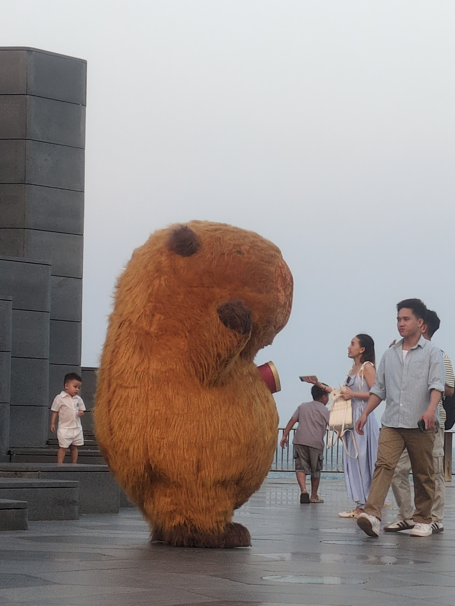 In Bình Kiến, Vietnam, a giant brown teddy bear sculpture sits on a platform accessible by gray concrete steps. A young child in white stands on the steps. Above the bear and to the side, several peop…read more