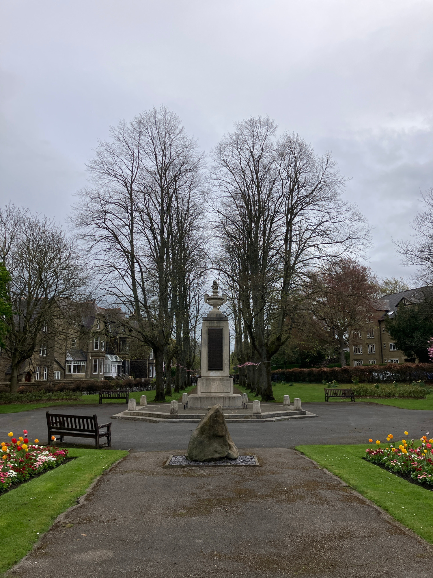 This media file captures a serene view of a public park or garden, likely in Bradford, United Kingdom, under an overcast sky. The image is composed with a central war memorial, flanked by tall, bare d…read more