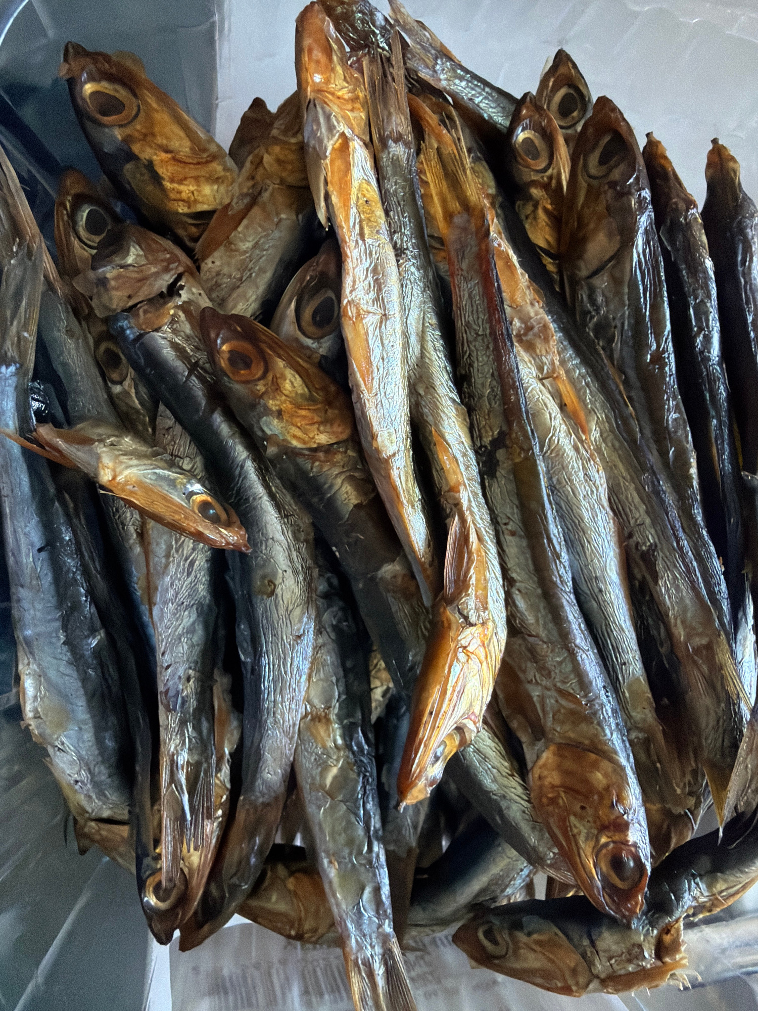 A close-up photograph shows a dense pile of small, whole, dried or smoked fish. The fish are arranged haphazardly, with many heads and bodies overlapping. The coloration of the fish varies from silver…read more