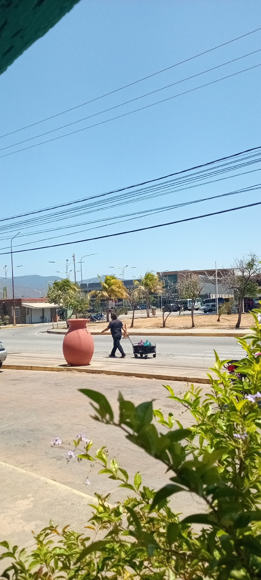 A man wearing a dark shirt and pants is walking across a crosswalk, pulling a black cart with various items in it. To his left is a large, terracotta-colored pot, and in the foreground, a bush with gr…read more