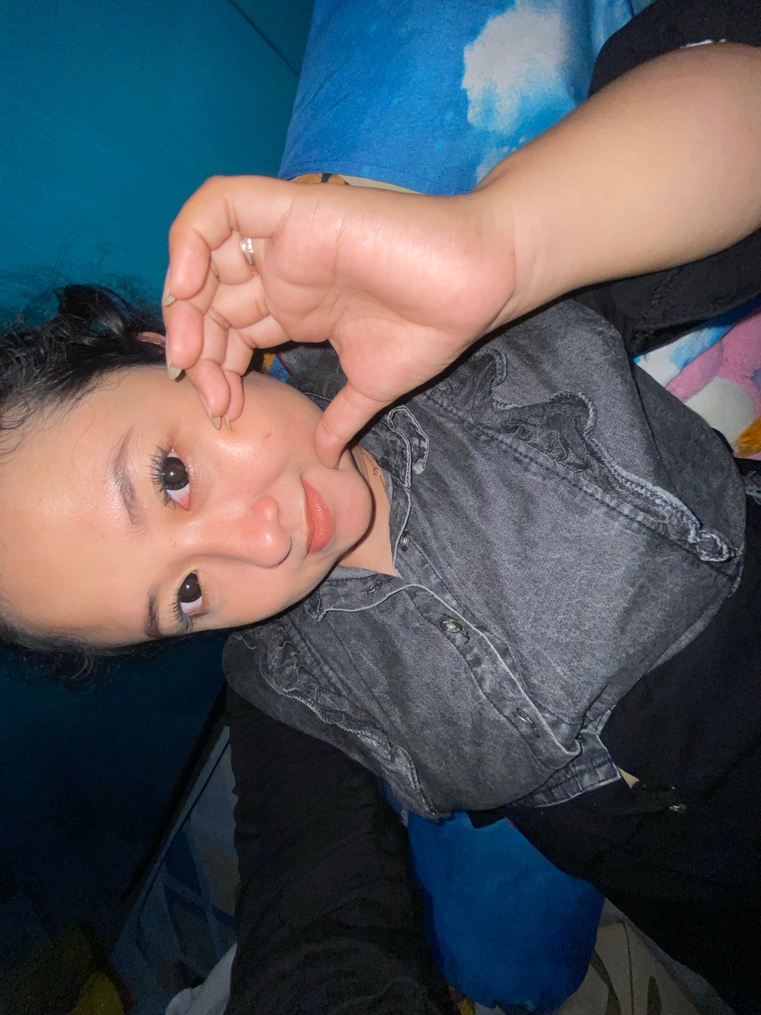 A woman is lying on a blue pillow, wearing a black denim shirt and black pants. She is indoors. The location is Gelam, Indonesia.