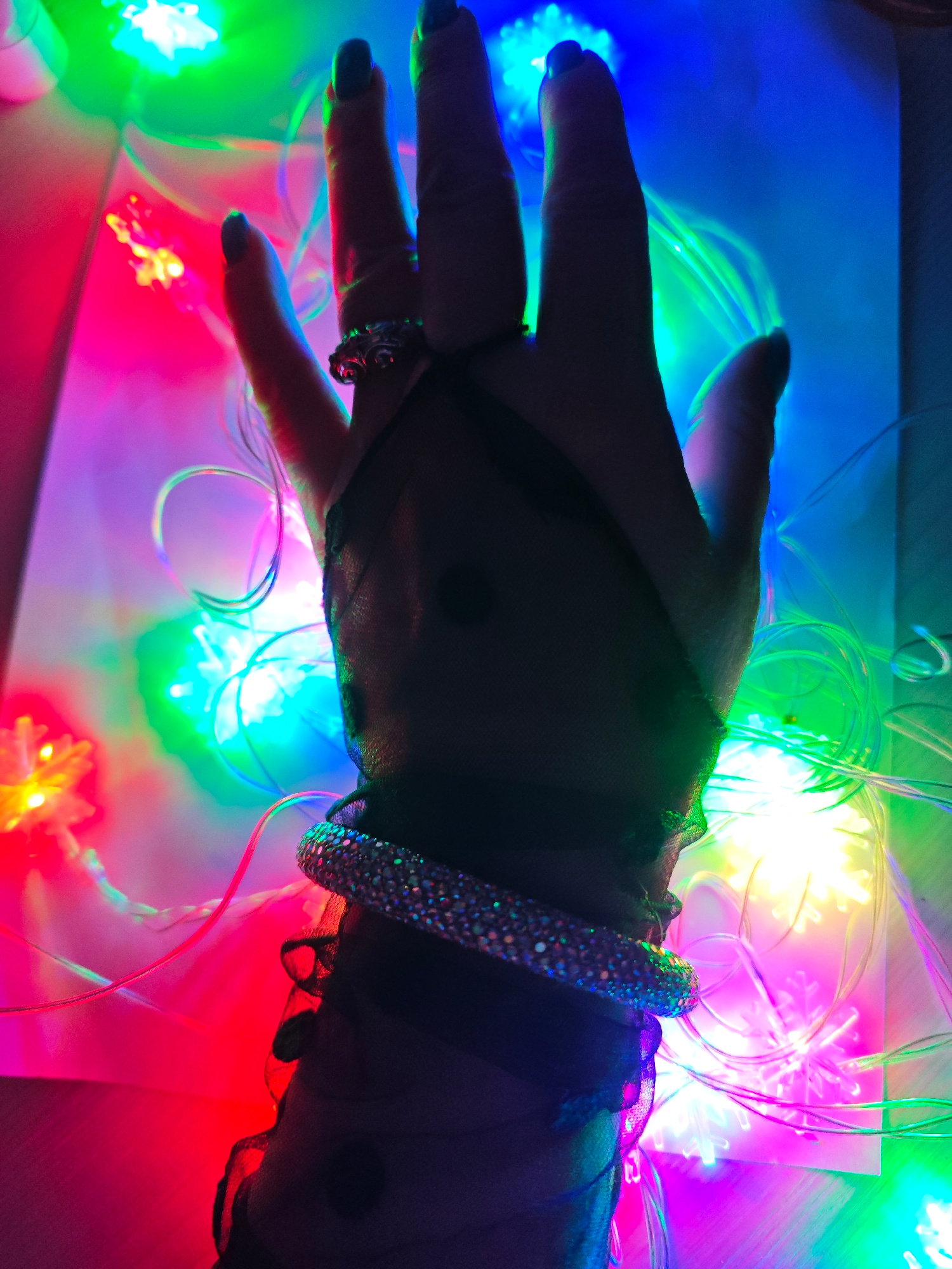 A hand wearing a black, sheer polka-dot glove and a sparkling bracelet is positioned on a white surface surrounded by colorful LED lights. A ring adorns one of the fingers. The lighting is predominant…read more