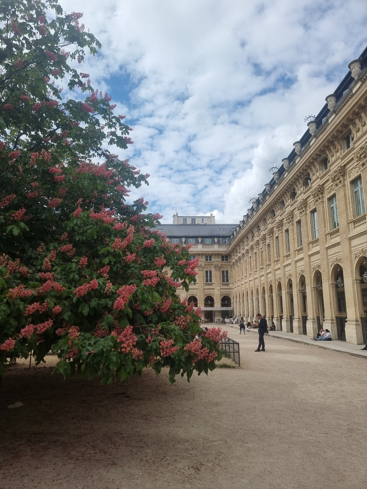 The image displays a picturesque scene in what appears to be a historic urban setting, likely Paris, France, given the architectural style. The view is composed of an ornate building, a wide gravel pa…read more