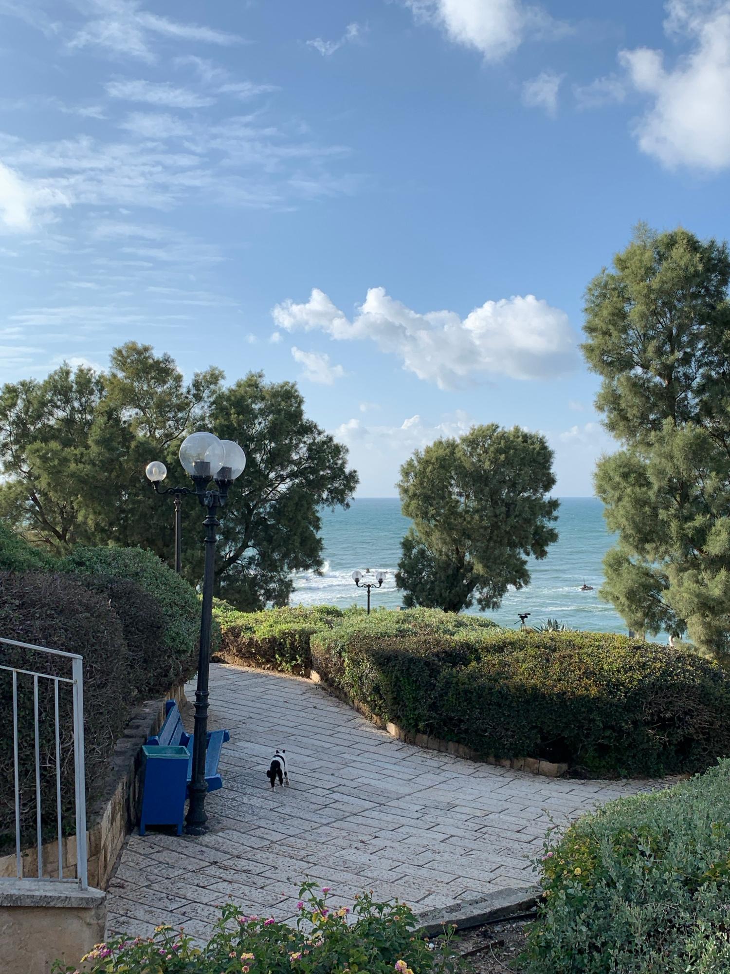 This daytime image displays a scenic coastal promenade in Tel Aviv, Israel, specifically within the historic Jaffa area overlooking the Mediterranean Sea. A winding pathway, paved with light-colored r…read more