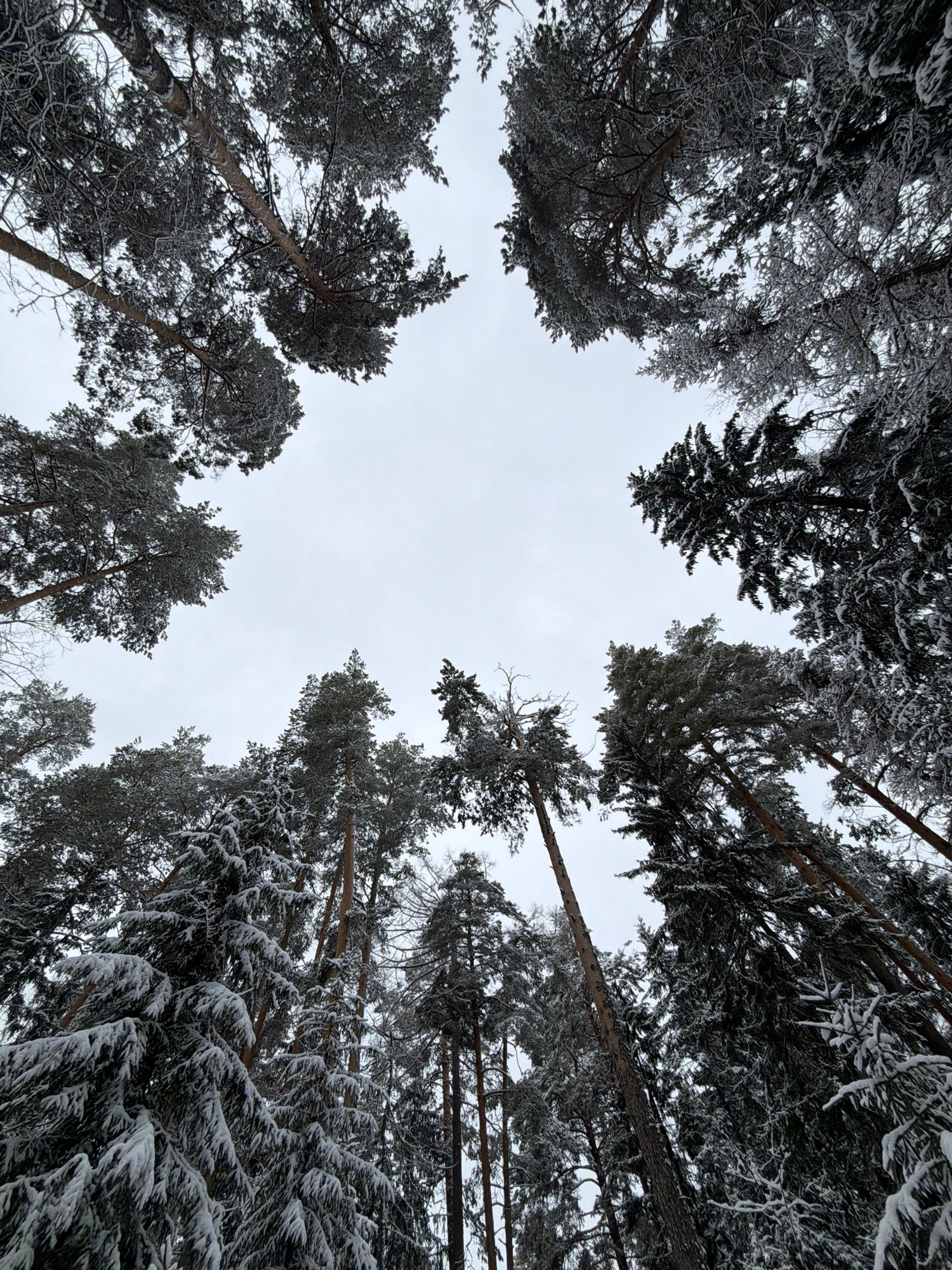 The image is a low-angle shot looking up into a snow-covered forest. The trees are tall and covered in a layer of snow, with the branches reaching towards the overcast sky. The sky is a pale gray, pro…read more