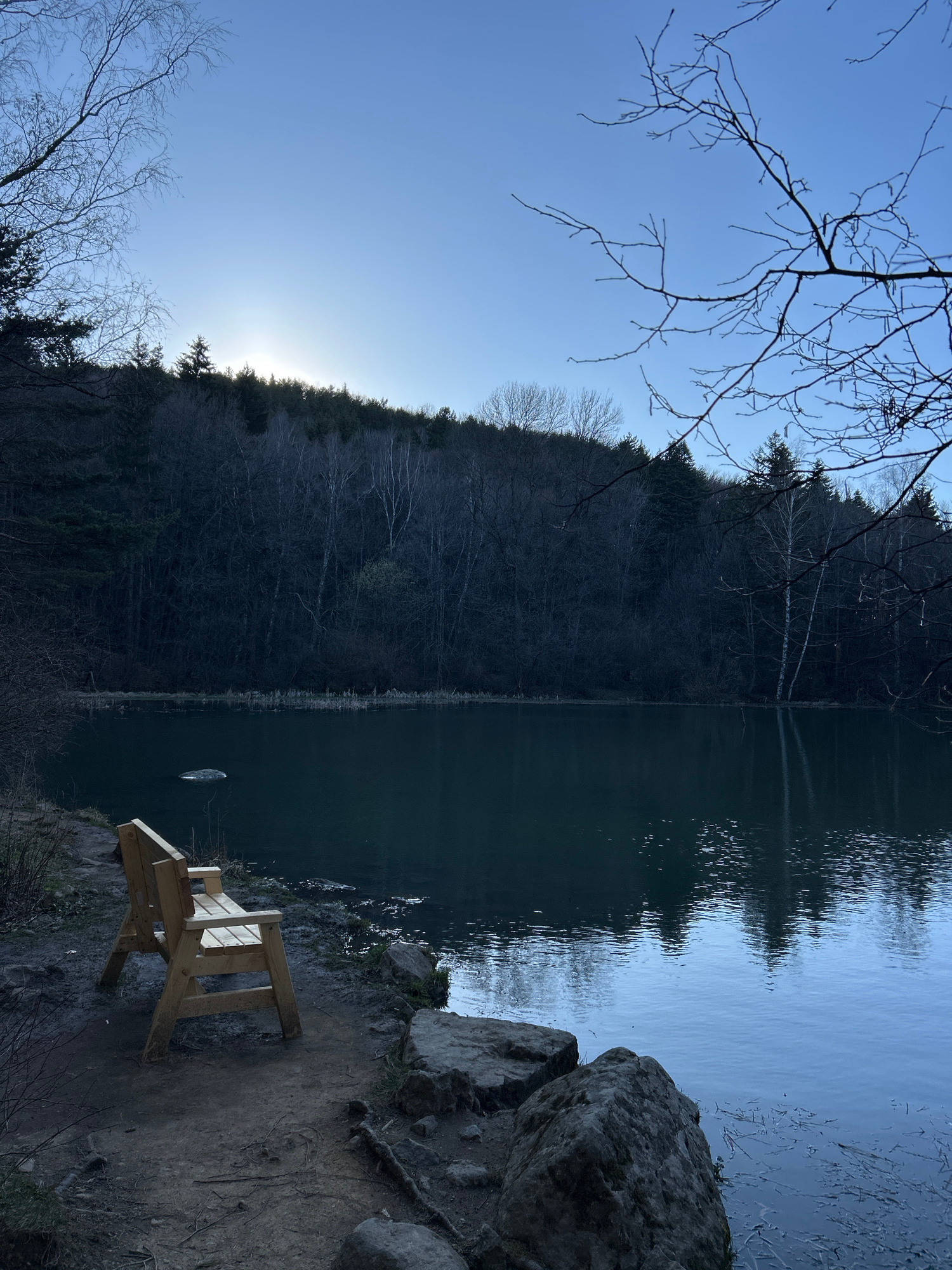 A landscape photograph shows a body of water bordered by a treeline and rocky edge. On the right side of the frame is a wooden bench situated on a dirt path next to the rocky edge, with large rocks st…read more