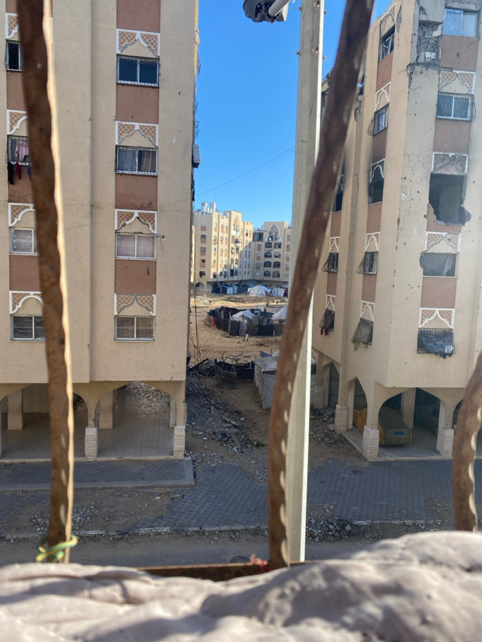 A damaged building stands with blown-out windows and structural gaps. Across a narrow alley, another building shows similar damage. Tents cluster in the space between the buildings, amidst rubble and…read more