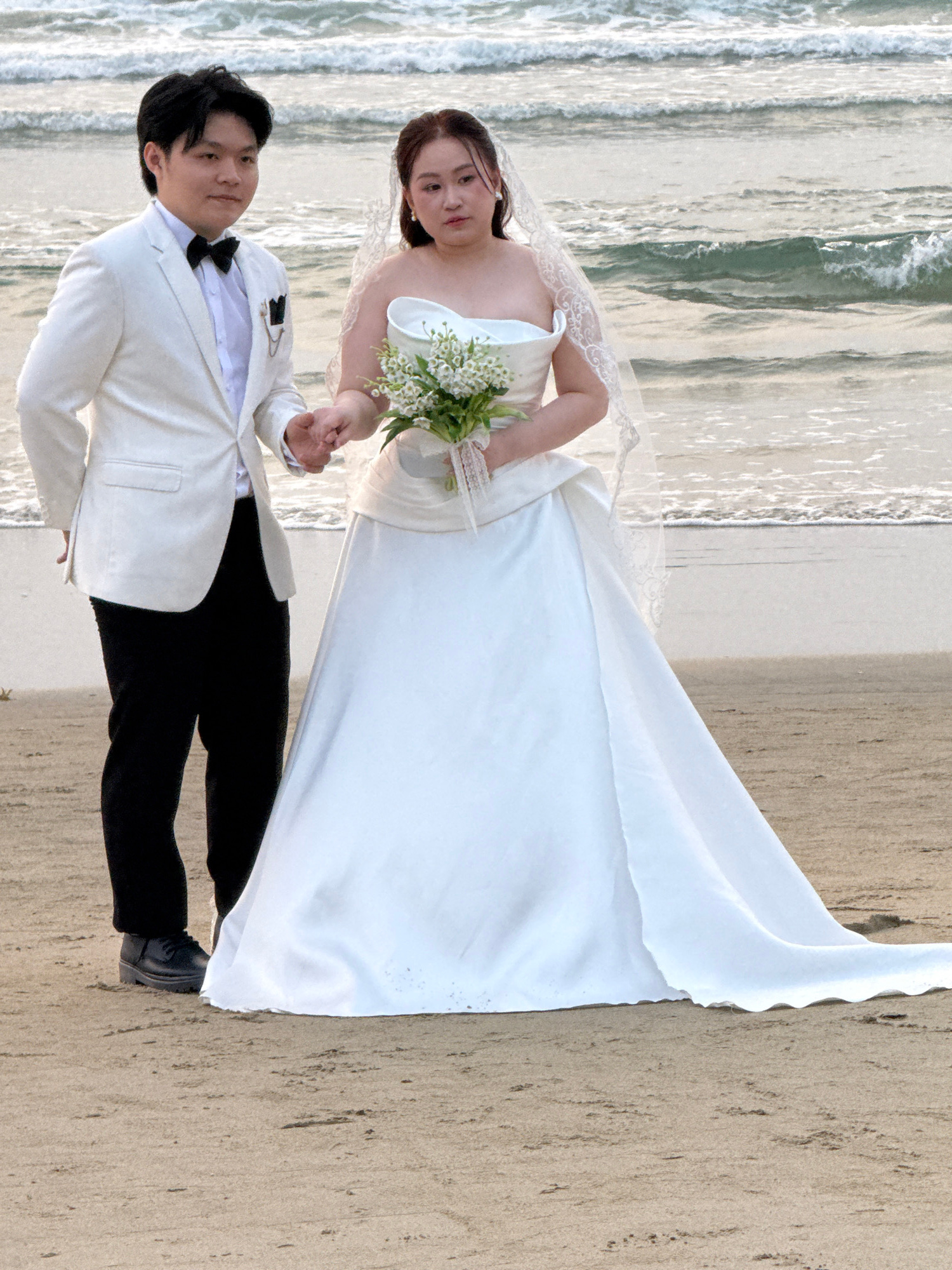 A wedding photo shows a couple standing on a beach. The bride wears a white dress with a veil and holds a bouquet of white flowers. The groom wears a white jacket and black pants with a bowtie. The ba…read more