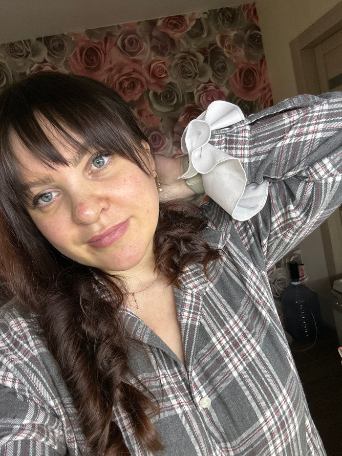 An adult female subject is depicted in a close-up, indoor selfie. She has dark brown, wavy hair with bangs, light blue eyes, and light skin tone. Visible on her face are slight redness on the nose and…read more
