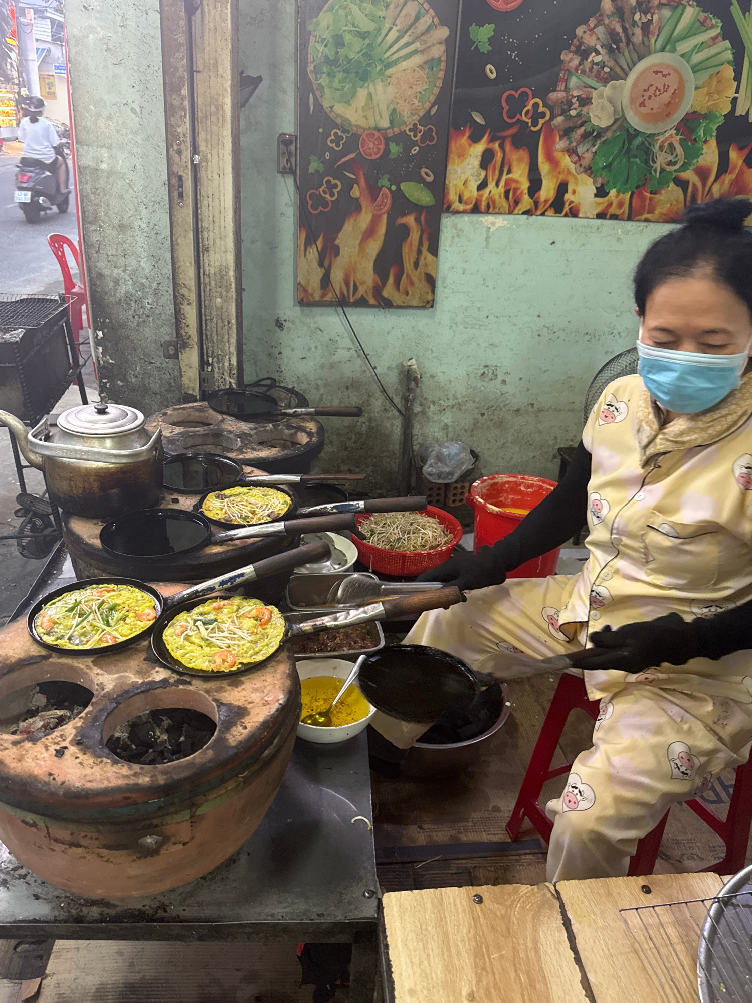The image captures a bustling street food stall in Đà Nẵng, Vietnam, centered around a vendor preparing food. A woman, the primary subject, is shown from the waist up, actively cooking. She wears a li…read more
