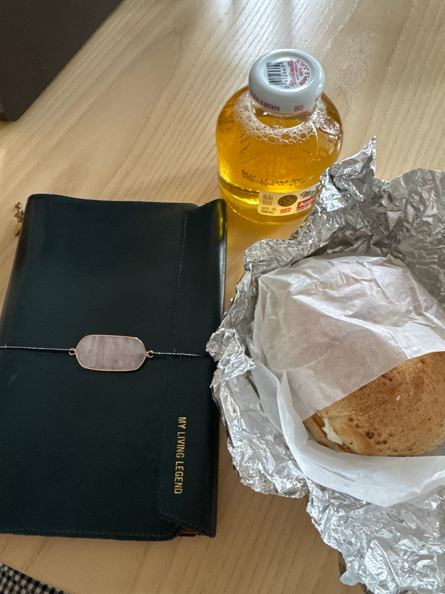 The image shows a table setting. There's a bottle of Martinelli's apple juice, a sandwich wrapped in foil and paper, and a black clutch wallet with a rose quartz pendant. The words "MY LIVING LEGEND"…read more