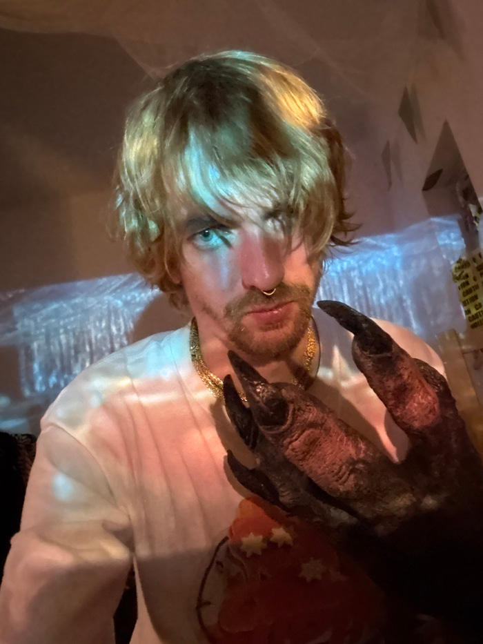 A blond man with a nose ring, light facial hair, and a gold chain necklace poses with a clawed monster hand resting on his shoulder, near a decorated orange object. The scene is lit with an unusual li…read more