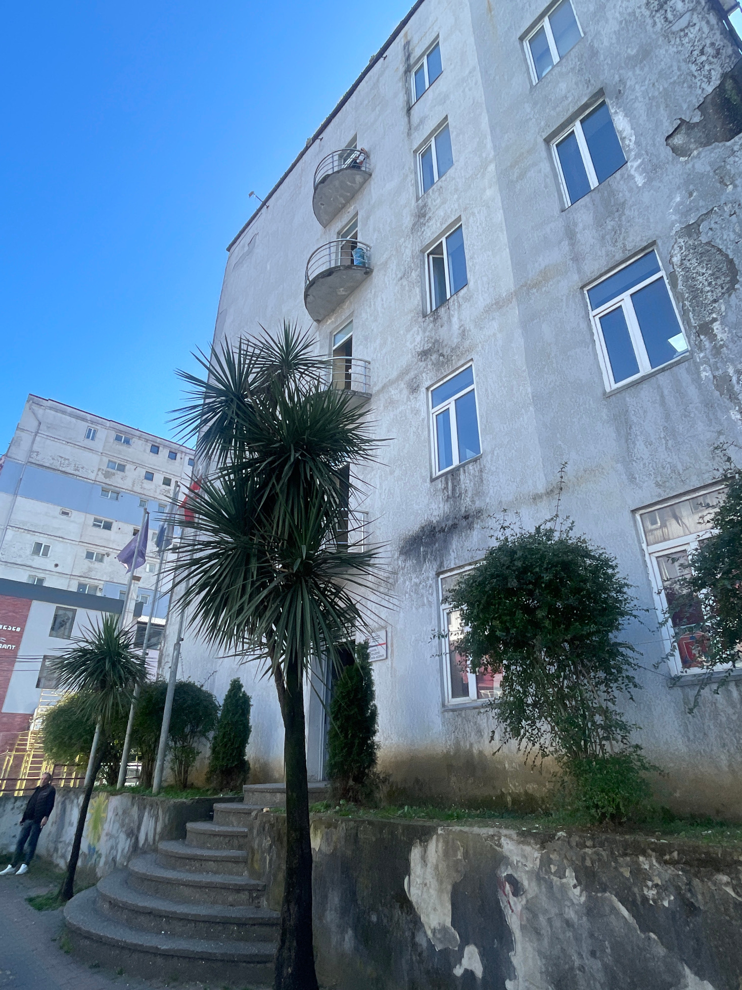 The image captures a scene in Batumi, Georgia, featuring a weathered, light-grey building with several rectangular windows. The windows have white frames and blue glass. The building has some discolor…read more